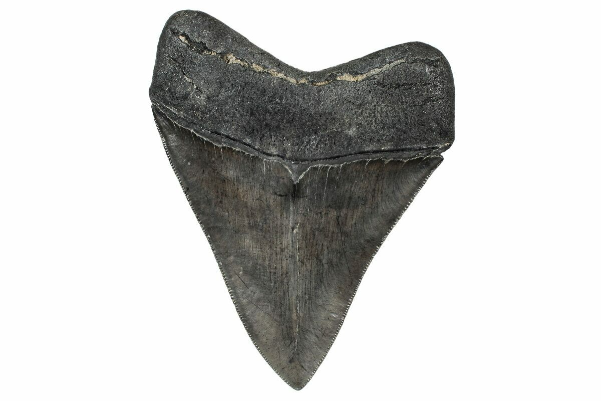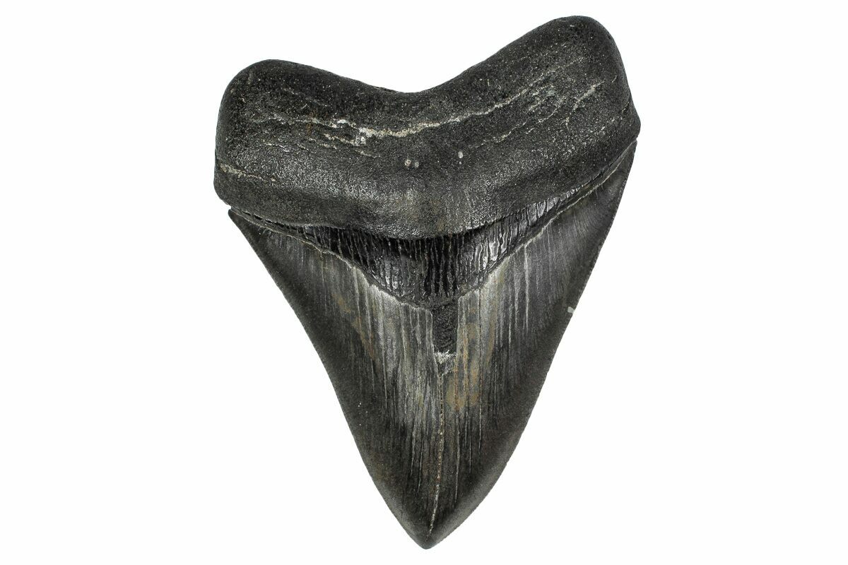 This is a 4.43" long fossil megalodon tooth collected from the Savannah River area along the border of Georgia and South Carolina. The tooth would have come from an adult, prehistoric, mega-shark in the 35+ foot size range.
