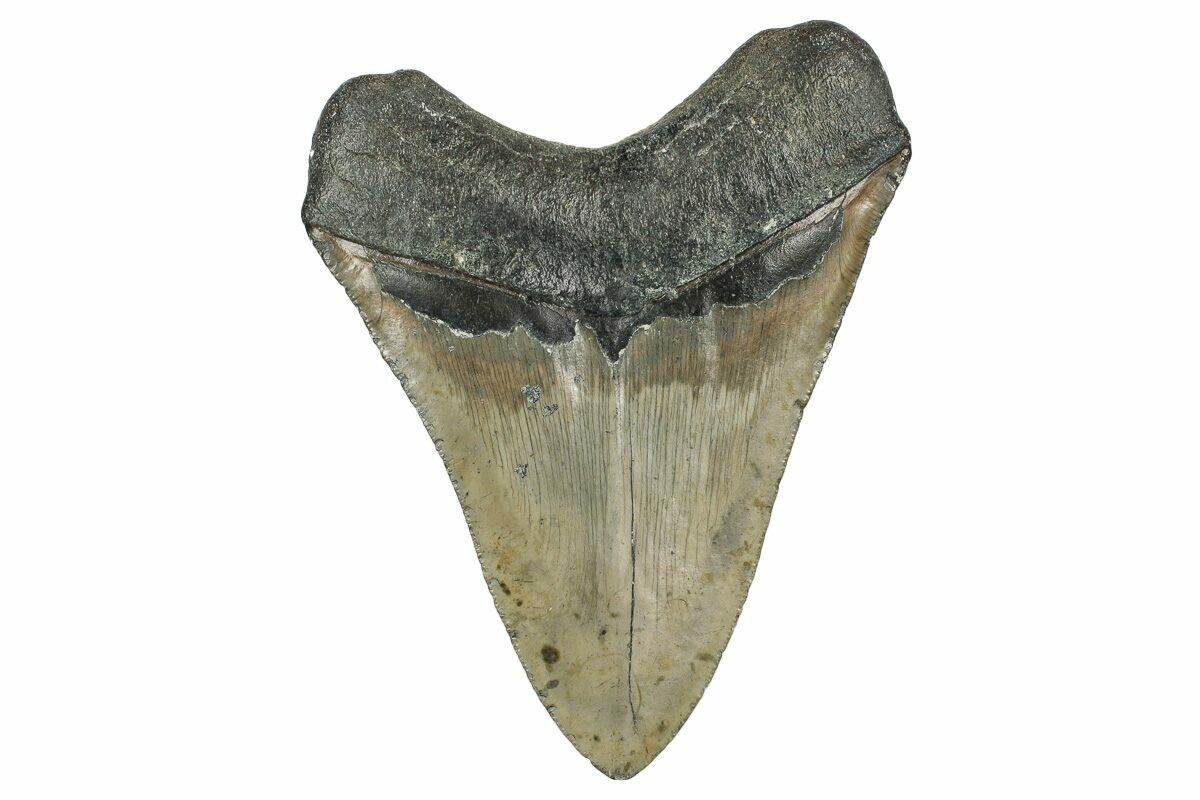 This is a serrated, 4.46" long megalodon tooth collected on the North Carolina coast. It was found by commercial divers collecting "the ledges" in about 100 feet of water. It would have eroded out of the Pungo River Formation, putting its age in the range of 13.8 to 16 million years old. A tooth of this size would have come from a prehistoric, mega-shark in the 35+ foot size range.