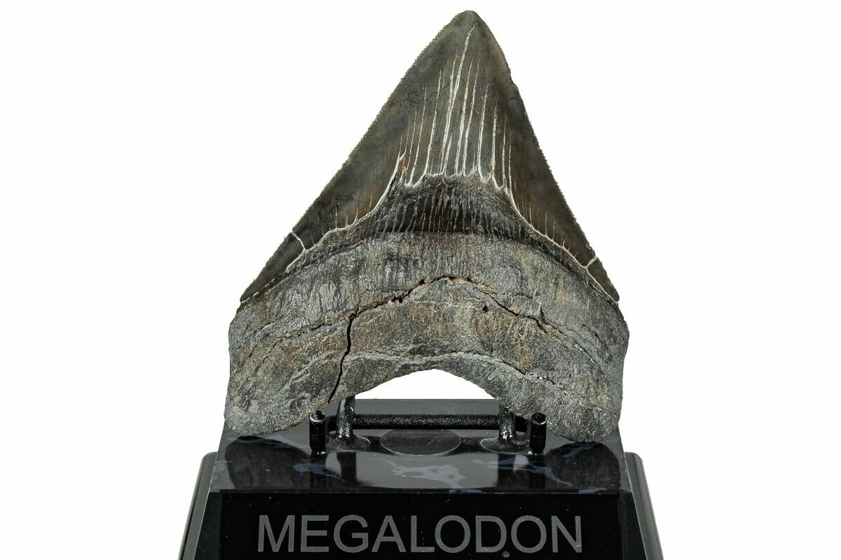 This is a beautiful, serrated, 4.51" long fossil megalodon tooth collected in South Carolina. A tooth of this size would have come from a prehistoric mega-shark in the 30+ foot size range.