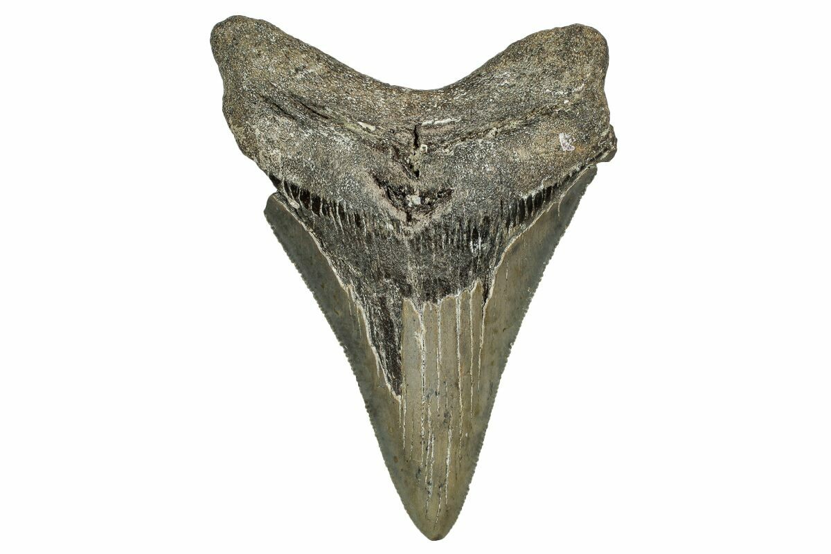 The standard measure for megalodon teeth is slant height, or the longest edge of the tooth. Adult megalodon teeth were typically in the 4 to 5 inch range: teeth over 6 inches are rare and represent super-sized individuals. Only a handful of teeth have ever been found over seven inches.