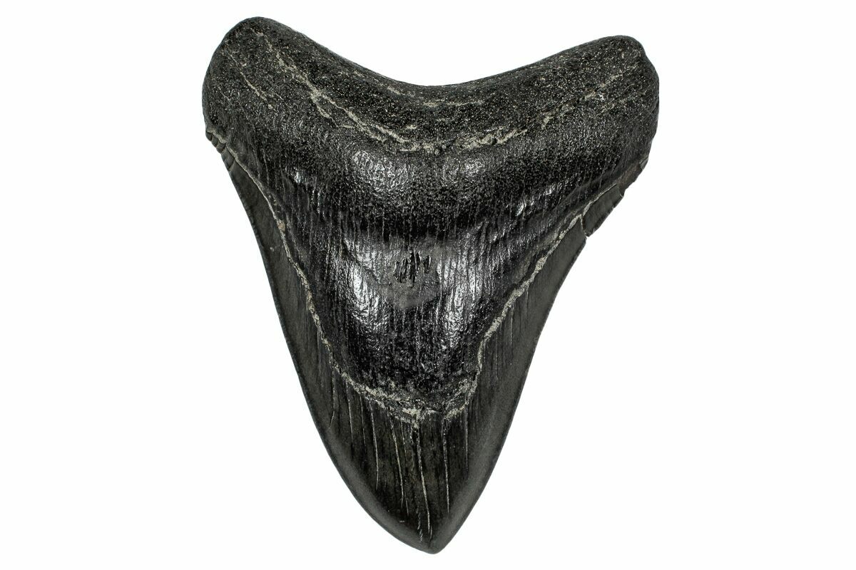 The standard measure for megalodon teeth is slant height, or the longest edge of the tooth. Adult megalodon teeth were typically in the 4 to 5 inch range: teeth over 6 inches are rare and represent super-sized individuals. Only a handful of teeth have ever been found over seven inches.