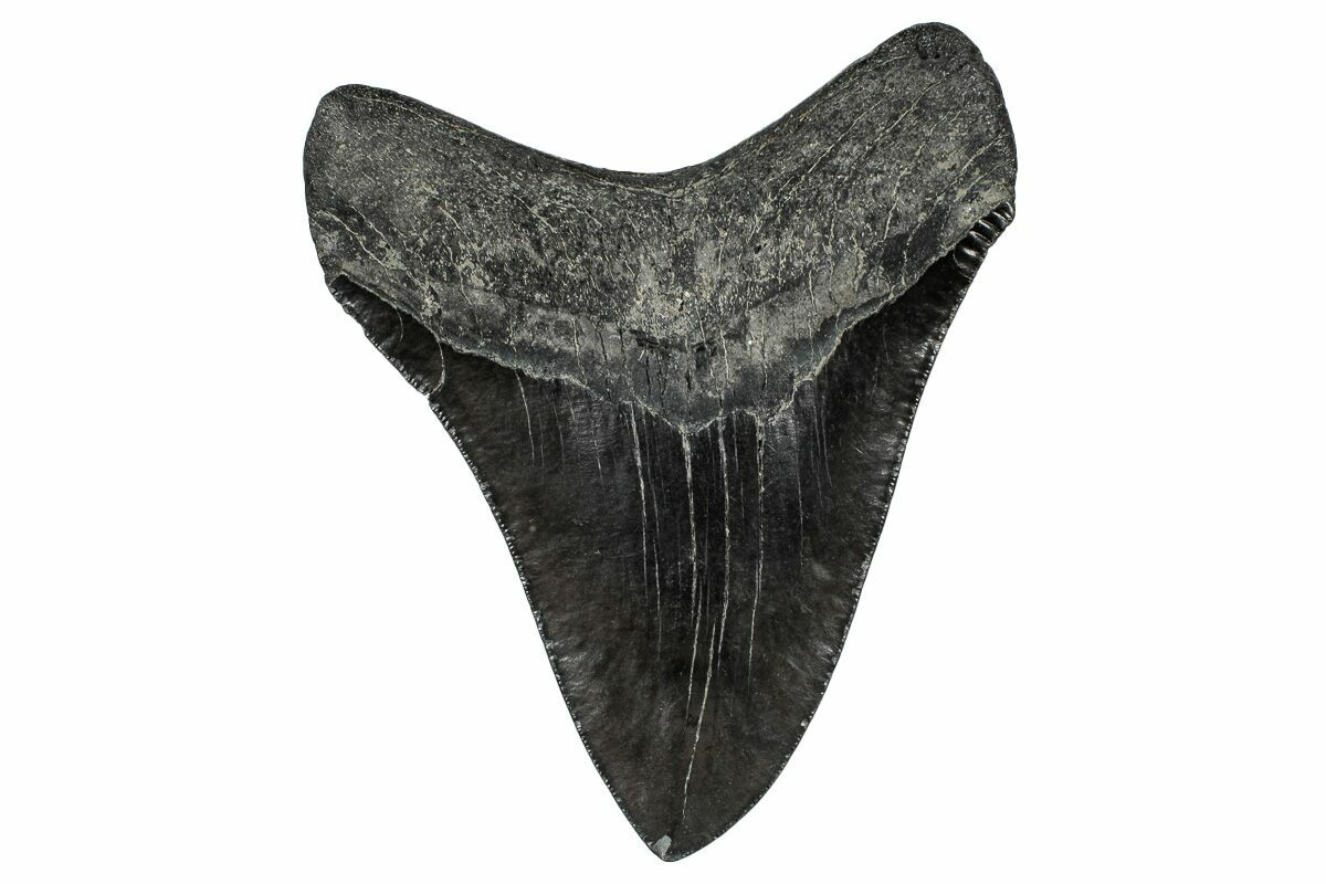 This is a 4.59" long fossil megalodon tooth collected from the Savannah River area along the border of Georgia and South Carolina. The tooth would have come from an adult, prehistoric, mega-shark in the 35+ foot size range.