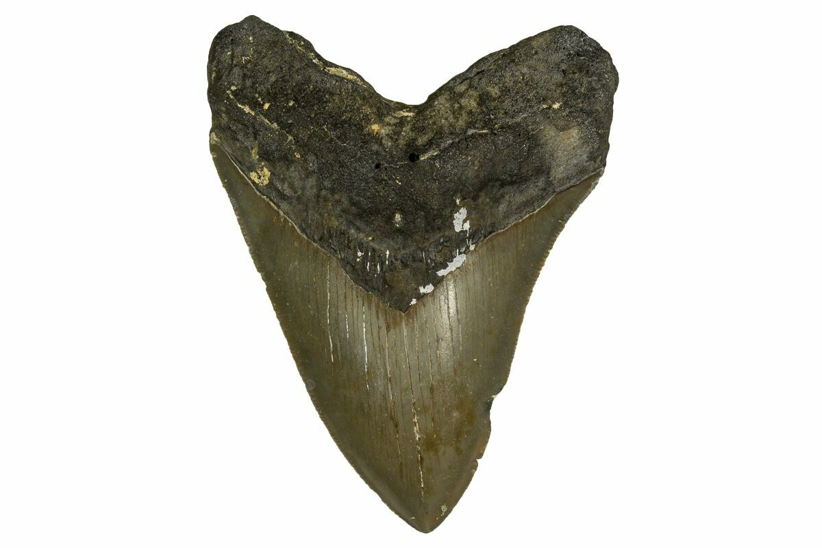 The standard measure for megalodon teeth is slant height, or the longest edge of the tooth. Adult megalodon teeth were typically in the 4 to 5 inch range: teeth over 6 inches are rare and represent super-sized individuals. Only a handful of teeth have ever been found over seven inches.
