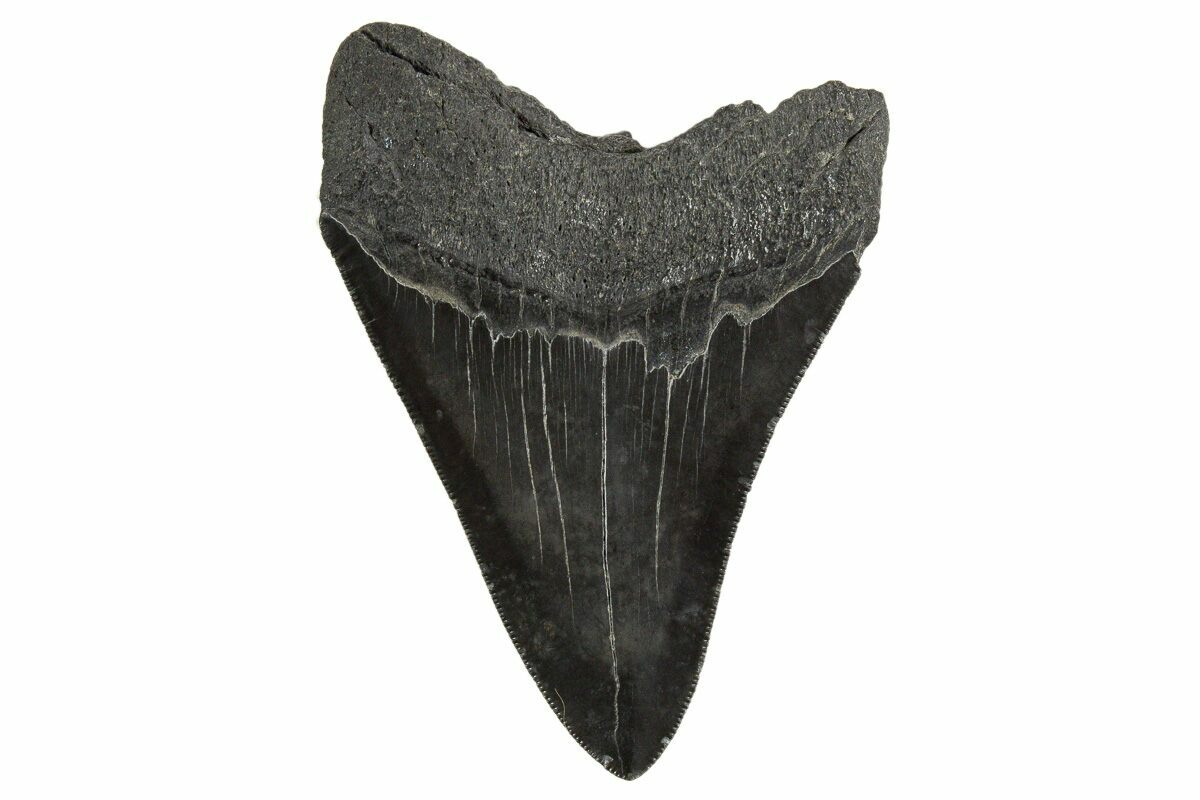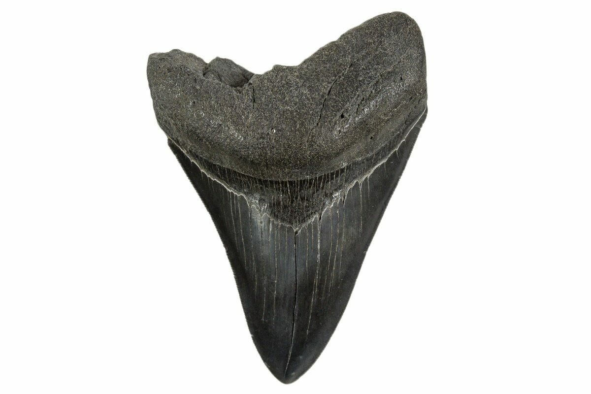This is a serrated, 4.62" long, fossil megalodon tooth collected in South Carolina. The tooth would have come from an adult, prehistoric, mega-shark in the 35+ foot size range. The serrations are worn, but many are still visible.