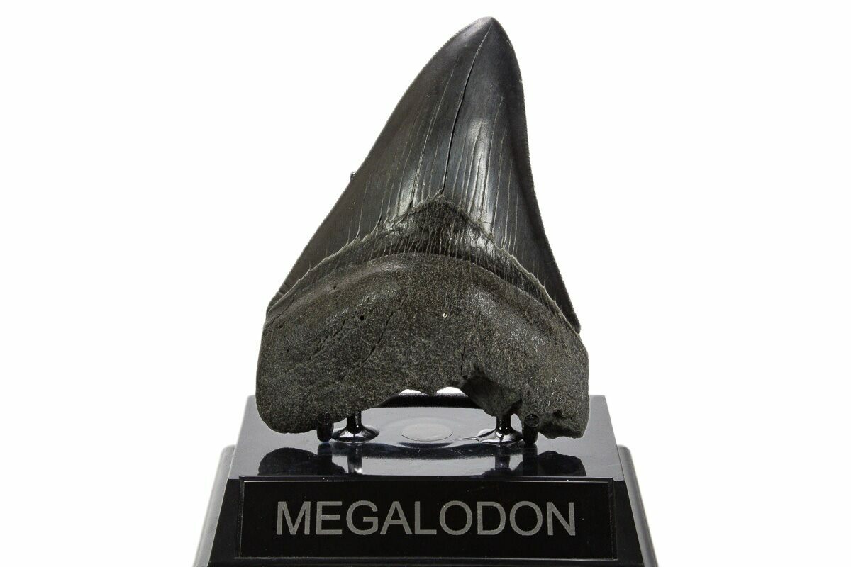 The standard measure for megalodon teeth is slant height, or the longest edge of the tooth. Adult megalodon teeth were typically in the 4 to 5 inch range: teeth over 6 inches are rare and represent super-sized individuals. Only a handful of teeth have ever been found over seven inches.