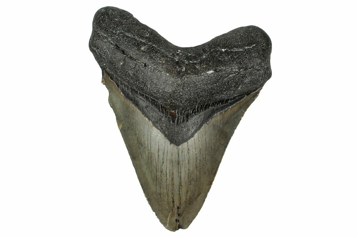 This is a serrated, 4.63" long megalodon tooth collected on the North Carolina coast. It was found by commercial divers collecting "the ledges" in about 100 feet of water. It would have eroded out of the Pungo River Formation, putting its age in the range of 13.8 to 16 million years old. A tooth of this size would have come from a prehistoric, mega-shark in the 35+ foot size range.