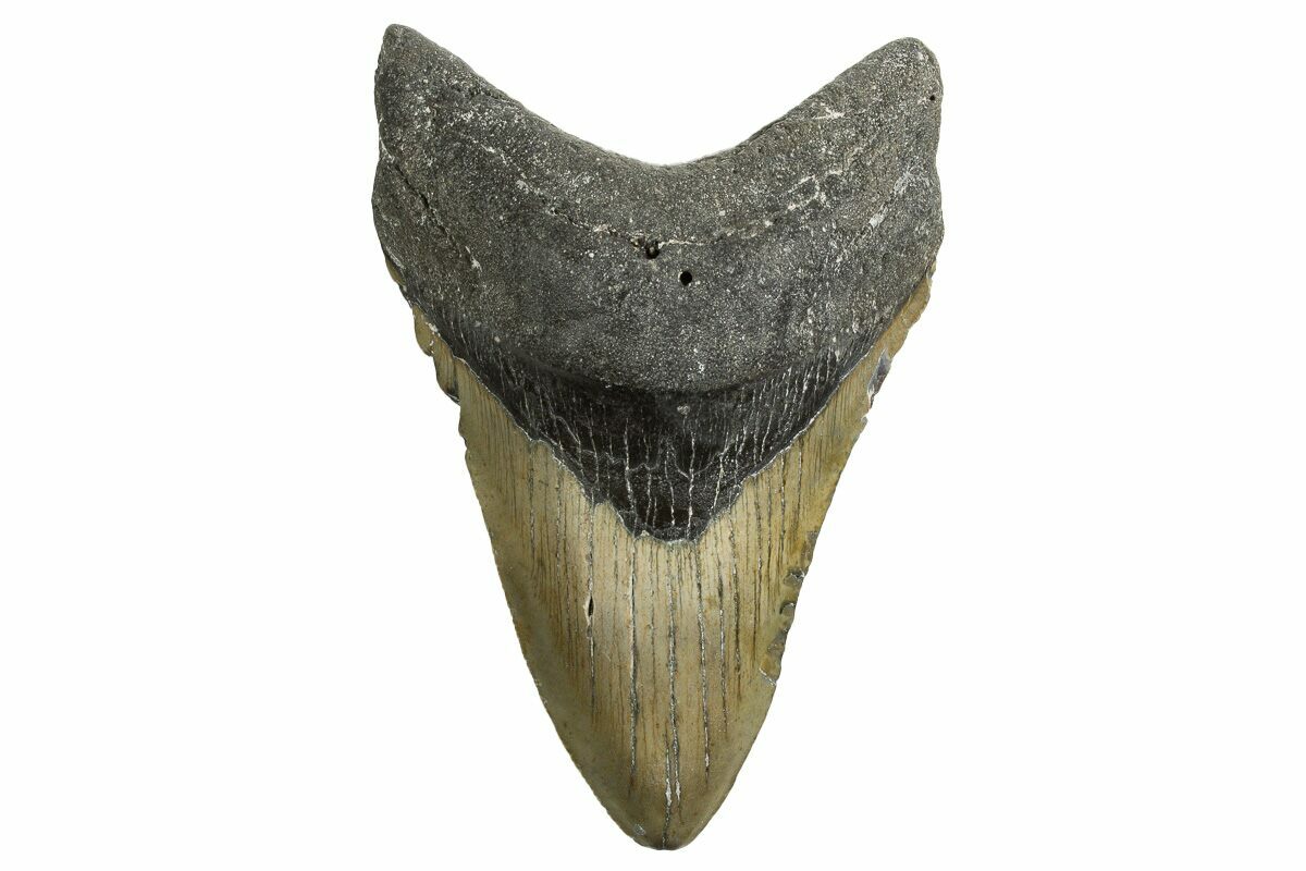 This is a serrated, 4.65" long megalodon tooth collected on the North Carolina coast. It was found by commercial divers collecting "the ledges" in about 100 feet of water. It would have eroded out of the Pungo River Formation, putting its age in the range of 13.8 to 16 million years old. A tooth of this size would have come from a prehistoric, mega-shark in the 35+ foot size range.