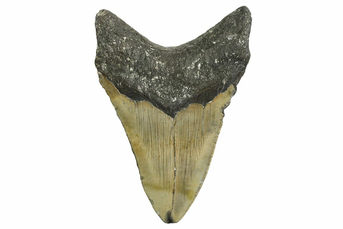 The standard measure for megalodon teeth is slant height, or the longest edge of the tooth. Adult megalodon teeth were typically in the 4 to 5 inch range: teeth over 6 inches are rare and represent super-sized individuals. Only a handful of teeth have ever been found over seven inches.