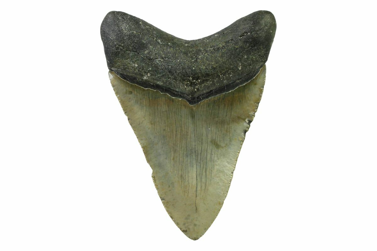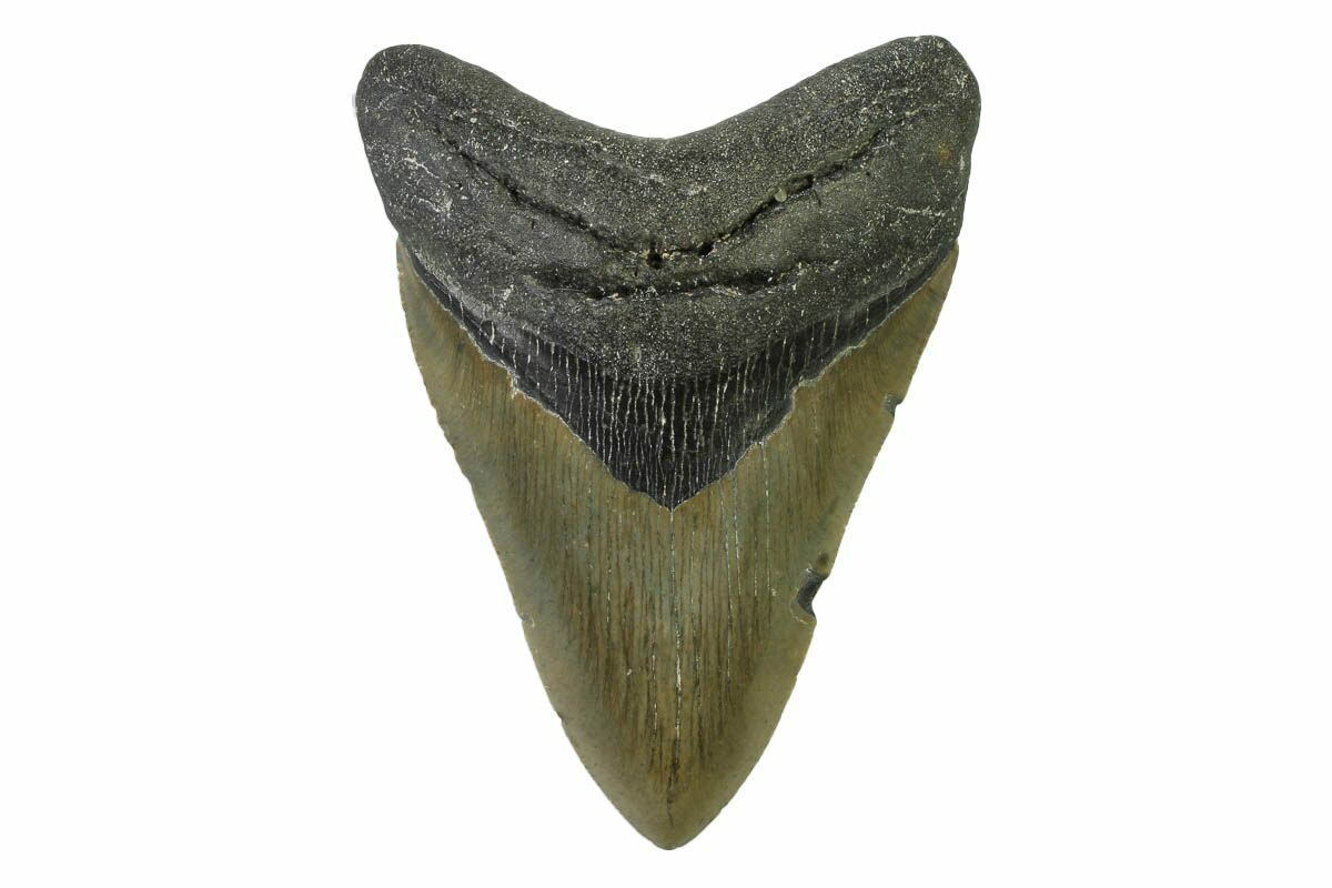 This is a serrated, 4.71" long megalodon tooth collected on the North Carolina coast. It was found by commercial divers collecting "the ledges" in about 100 feet of water. It would have eroded out of the Pungo River Formation, putting its age in the range of 13.8 to 16 million years old. A tooth of this size would have come from a prehistoric, mega-shark in the 35+ foot size range.