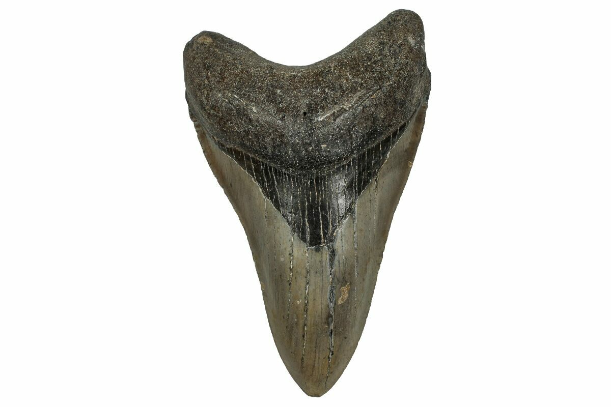 This is a serrated, 4.71" long megalodon tooth collected on the North Carolina coast. It was found by commercial divers collecting "the ledges" in about 100 feet of water. It would have eroded out of the Pungo River Formation, putting its age in the range of 13.8 to 16 million years old. A tooth of this size would have come from a prehistoric, mega-shark in the 35+ foot size range.