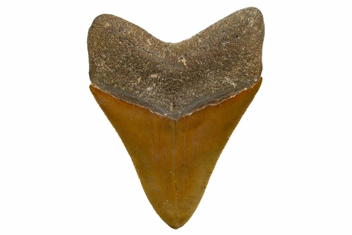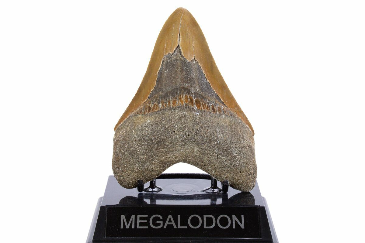 This is a serrated, 4.73" long megalodon tooth collected on the North Carolina coast. It was found by commercial divers collecting "the ledges" in about 100 feet of water. It would have eroded out of the Pungo River Formation, putting its age in the range of 13.8 to 16 million years old. A tooth of this size would have come from a prehistoric, mega-shark in the 35+ foot size range.