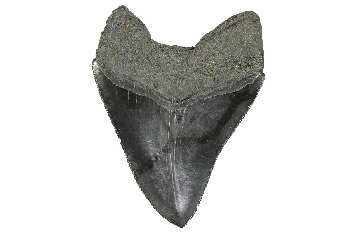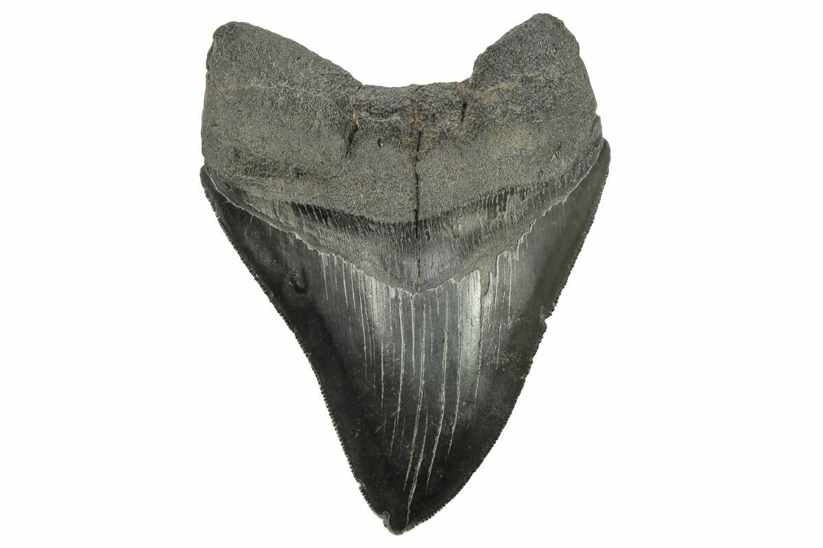 This is a serrated, 4.74" long, fossil Megalodon tooth collected in South Carolina. The tooth would have come from an adult, prehistoric, mega-shark in the 35+ foot size range.