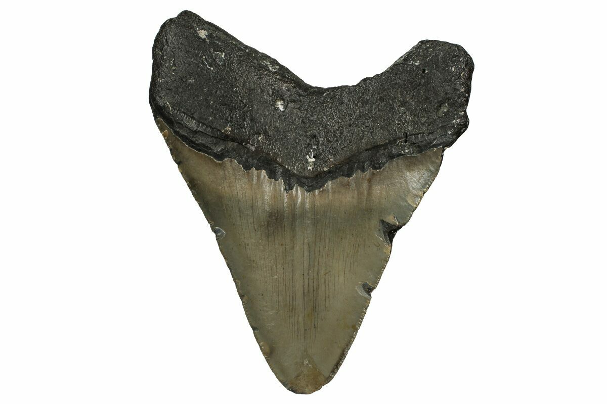The standard measure for megalodon teeth is slant height, or the longest edge of the tooth. Adult megalodon teeth were typically in the 4 to 5 inch range: teeth over 6 inches are rare and represent super-sized individuals. Only a handful of teeth have ever been found over seven inches.