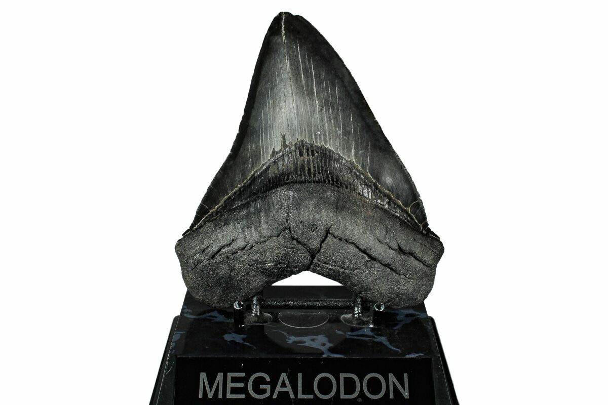 The standard measure for megalodon teeth is slant height, or the longest edge of the tooth. Adult megalodon teeth were typically in the 4 to 5 inch range: teeth over 6 inches are rare and represent super-sized individuals. Only a handful of teeth have ever been found over seven inches.