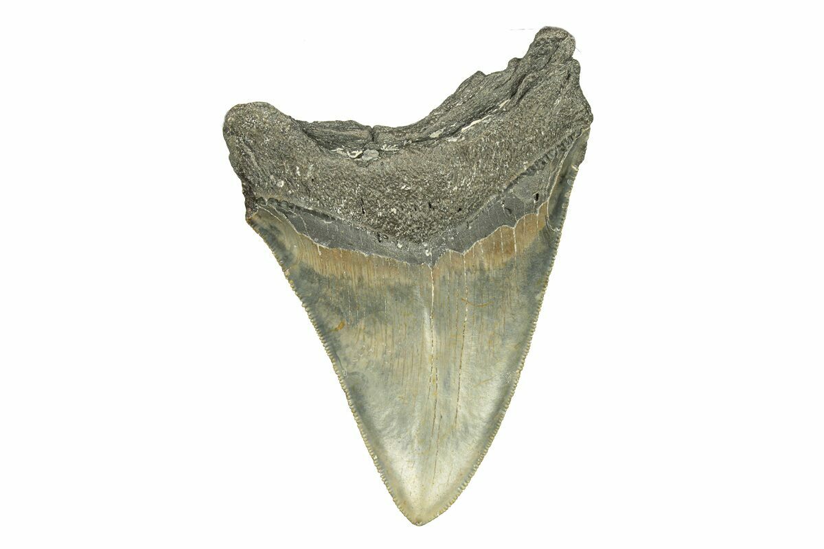 This is a sharply serrated, 4.83" long Megalodon tooth collected on the North Carolina coast. It was found by commercial divers collecting "the ledges" in about 100 feet of water. It would have eroded out of the Pungo River Formation, putting its age in the range of 13.8 to 16 million years old. A tooth of this size would have come from a prehistoric, mega-shark in the 35+ foot size range.