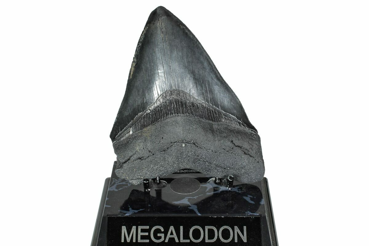 The standard measure for megalodon teeth is slant height, or the longest edge of the tooth. Adult megalodon teeth were typically in the 4 to 5 inch range: teeth over 6 inches are rare and represent super-sized individuals. Only a handful of teeth have ever been found over seven inches.