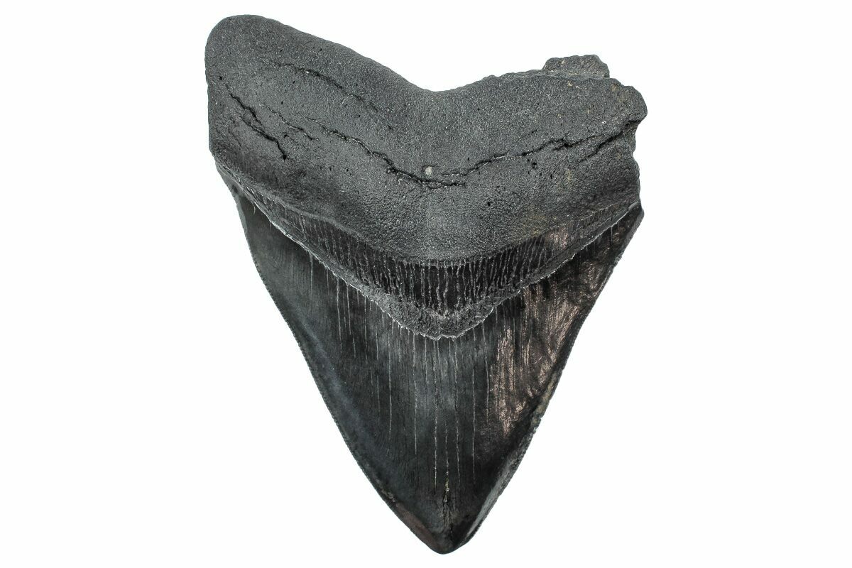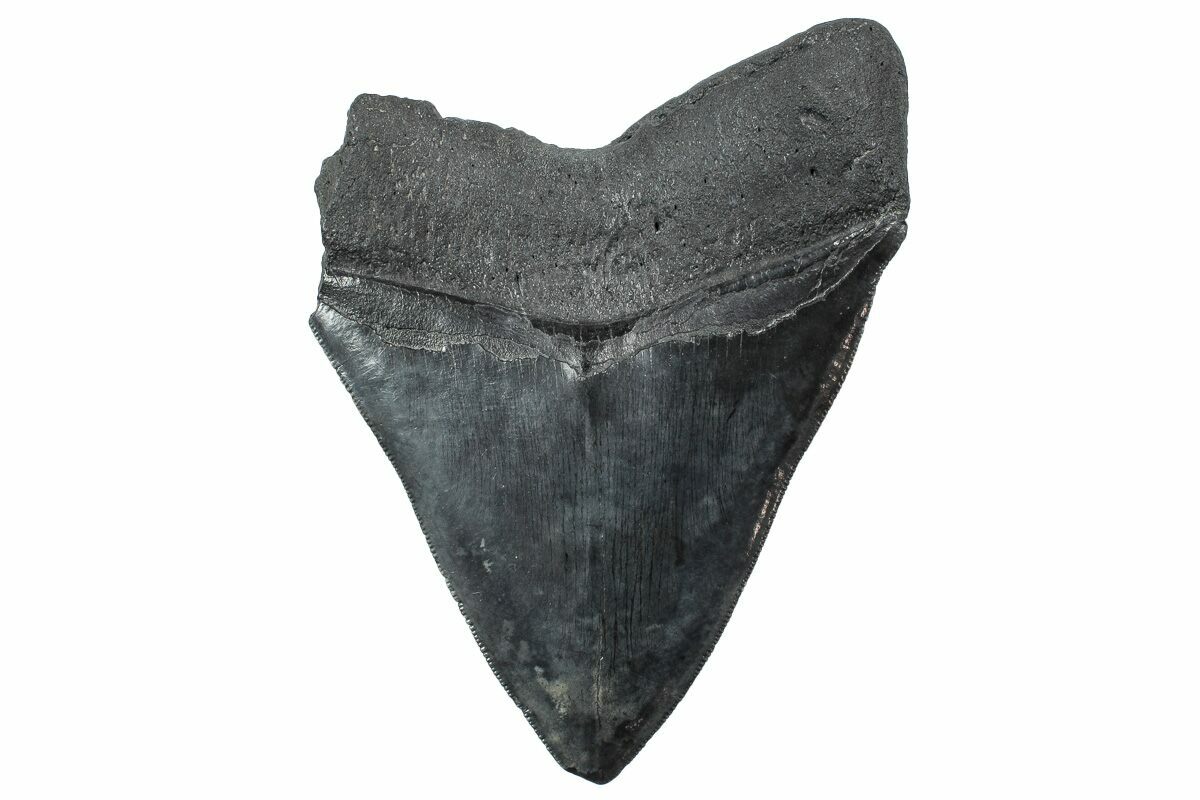 This is a beautiful, serrated, 4.83" long, fossil Megalodon tooth collected in South Carolina. The tooth would have come from an adult, prehistoric, mega-shark in the 35+ foot size range.