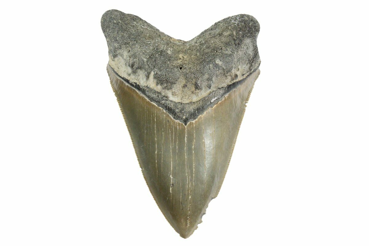 This is a serrated, 4.85" long megalodon tooth collected on the North Carolina coast. It was found by commercial divers collecting "the ledges" in about 100 feet of water. It would have eroded out of the Pungo River Formation, putting its age in the range of 13.8 to 16 million years old. A tooth of this size would have come from a prehistoric, mega-shark in the 35+ foot size range.