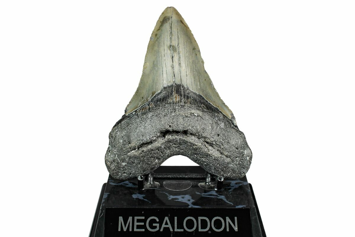 This is a serrated, 4.89" long megalodon tooth collected on the North Carolina coast. It was found by commercial divers collecting "the ledges" in about 100 feet of water. It would have eroded out of the Pungo River Formation, putting its age in the range of 13.8 to 16 million years old. A tooth of this size would have come from a prehistoric, mega-shark in the 35+ foot size range.