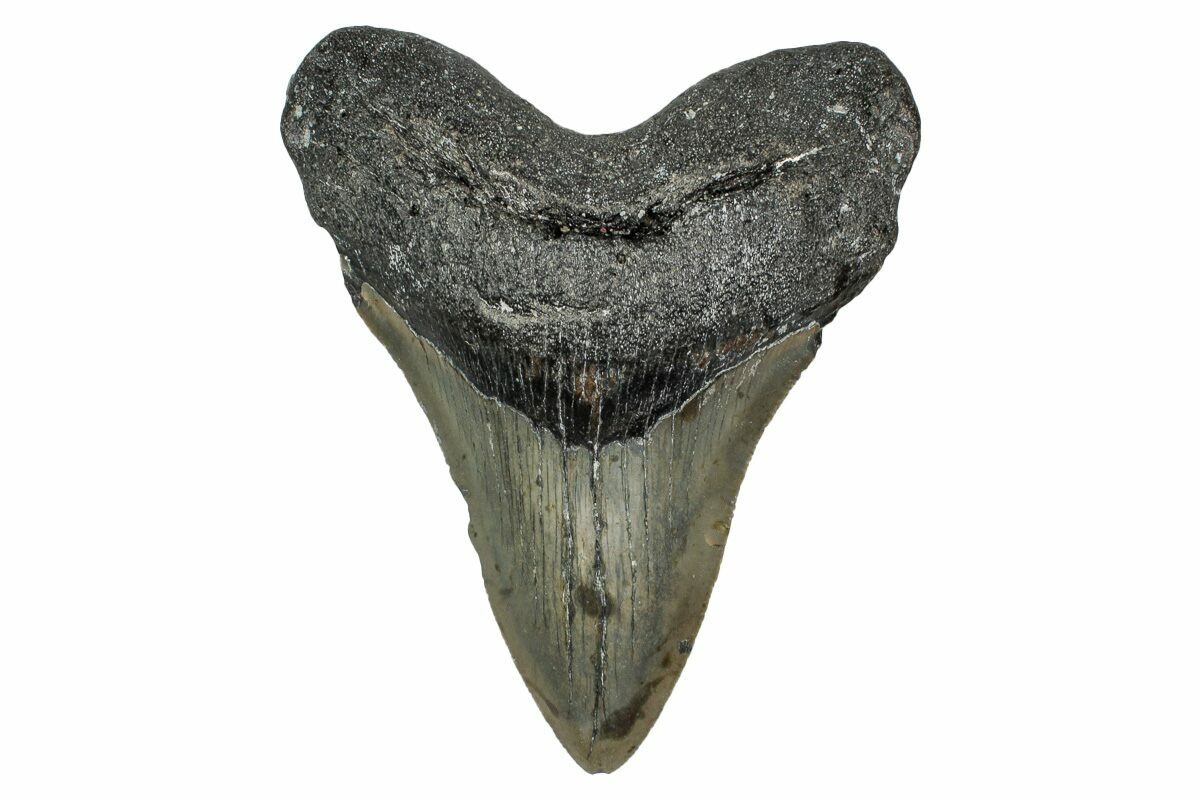 The standard measure for megalodon teeth is slant height, or the longest edge of the tooth. Adult megalodon teeth were typically in the 4 to 5 inch range: teeth over 6 inches are rare and represent super-sized individuals. Only a handful of teeth have ever been found over seven inches.