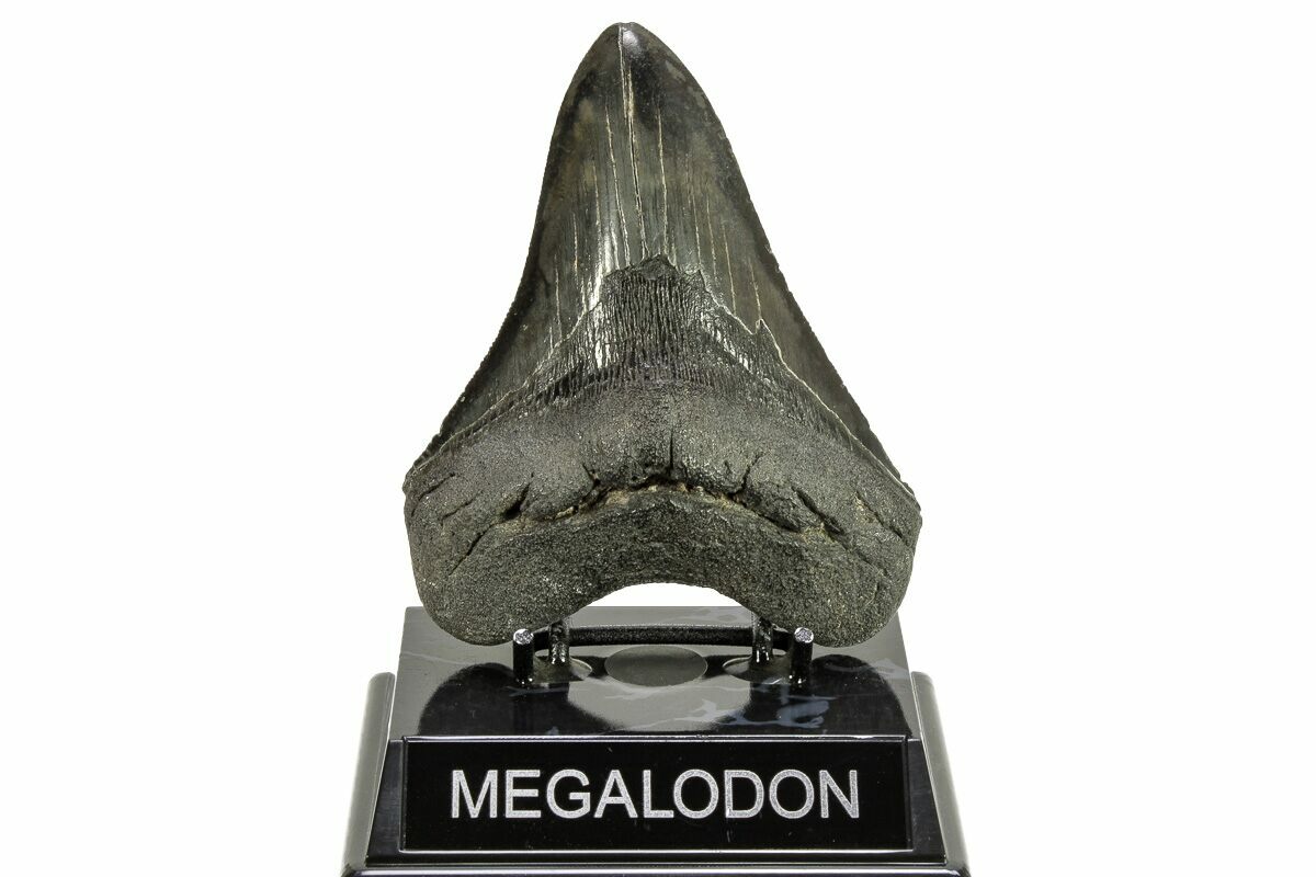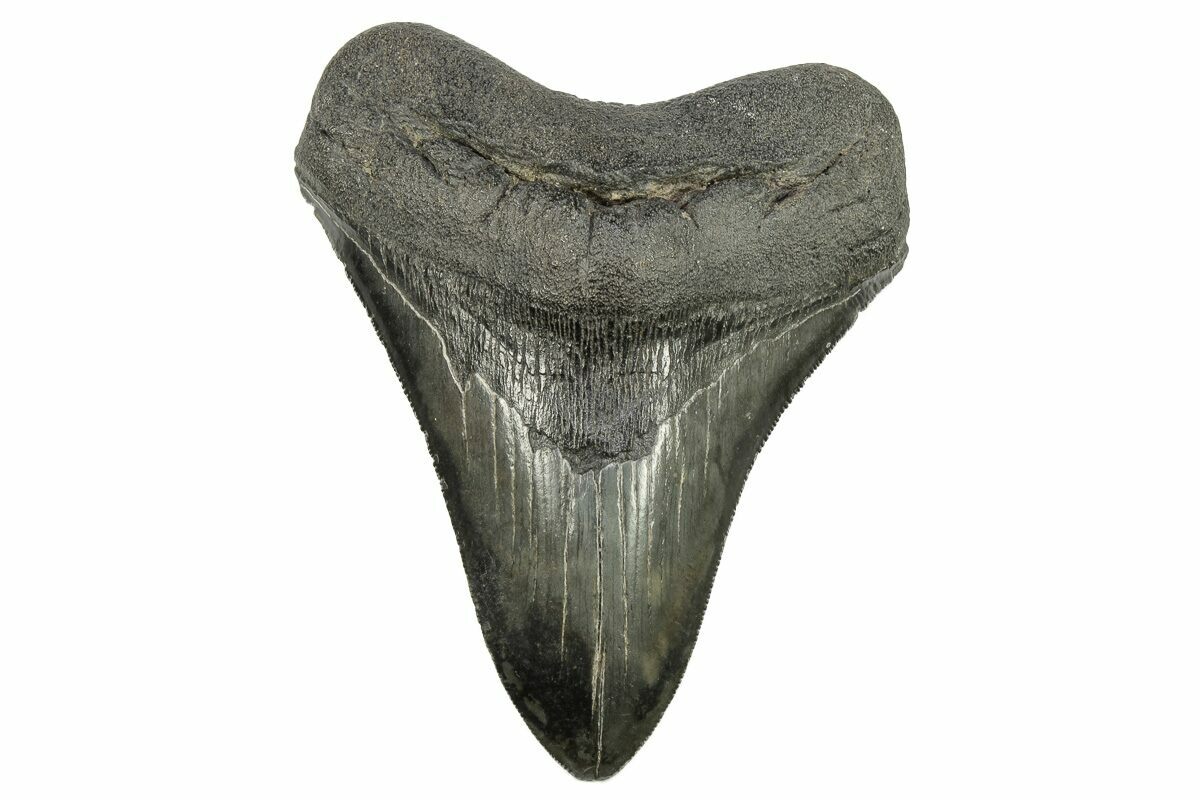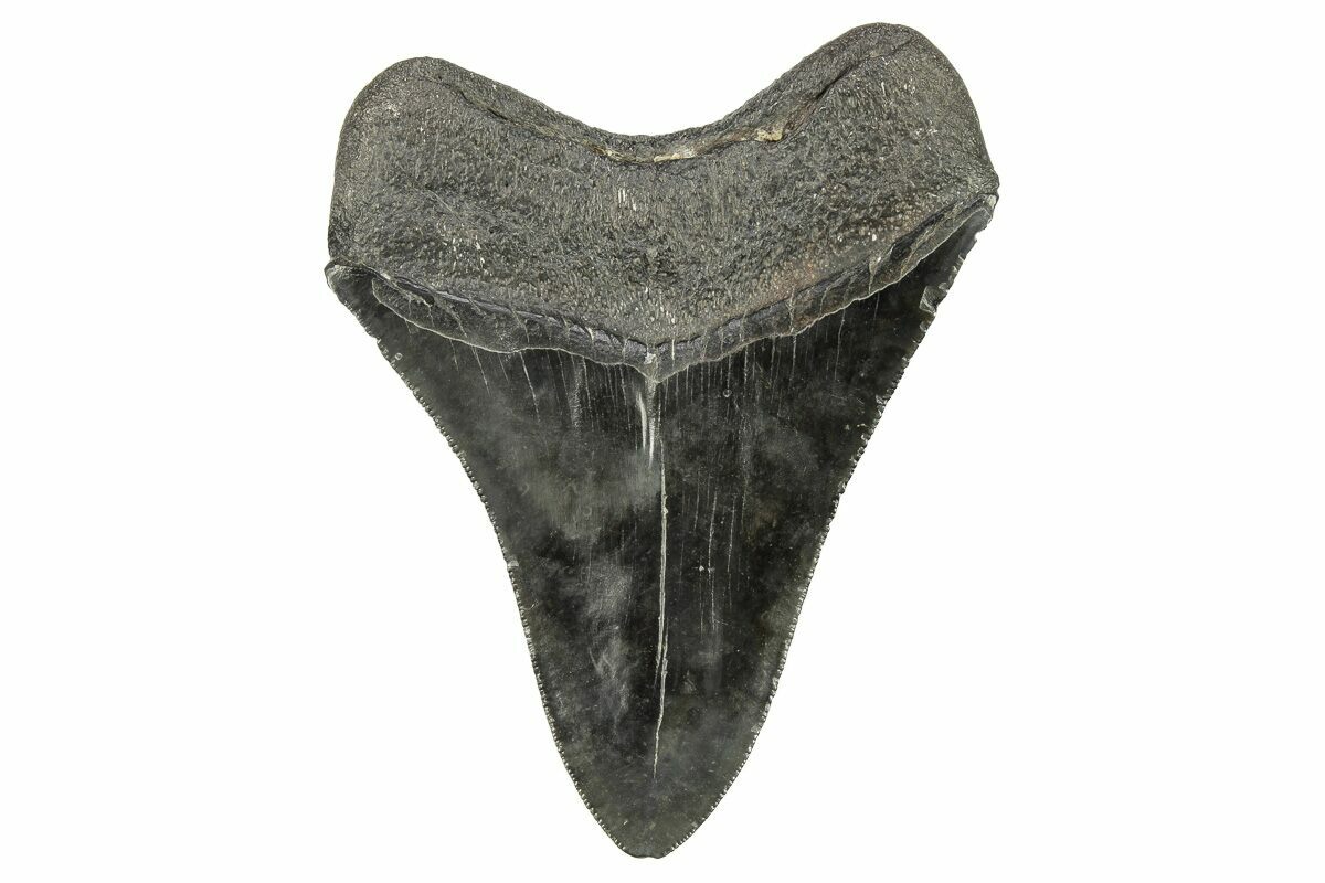 The standard measure for megalodon teeth is slant height, or the longest edge of the tooth. Adult megalodon teeth were typically in the 4 to 5 inch range: teeth over 6 inches are rare and represent super-sized individuals. Only a handful of teeth have ever been found over seven inches.