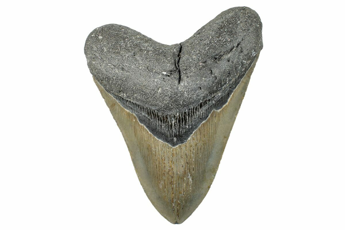 This is a serrated, 4.91" long Megalodon tooth collected on the North Carolina coast. It was found by commercial divers collecting "the ledges" in about 100 feet of water. It would have eroded out of the Pungo River Formation, putting its age in the range of 13.8 to 16 million years old. A tooth of this size would have come from a prehistoric, mega-shark in the 35+ foot size range.