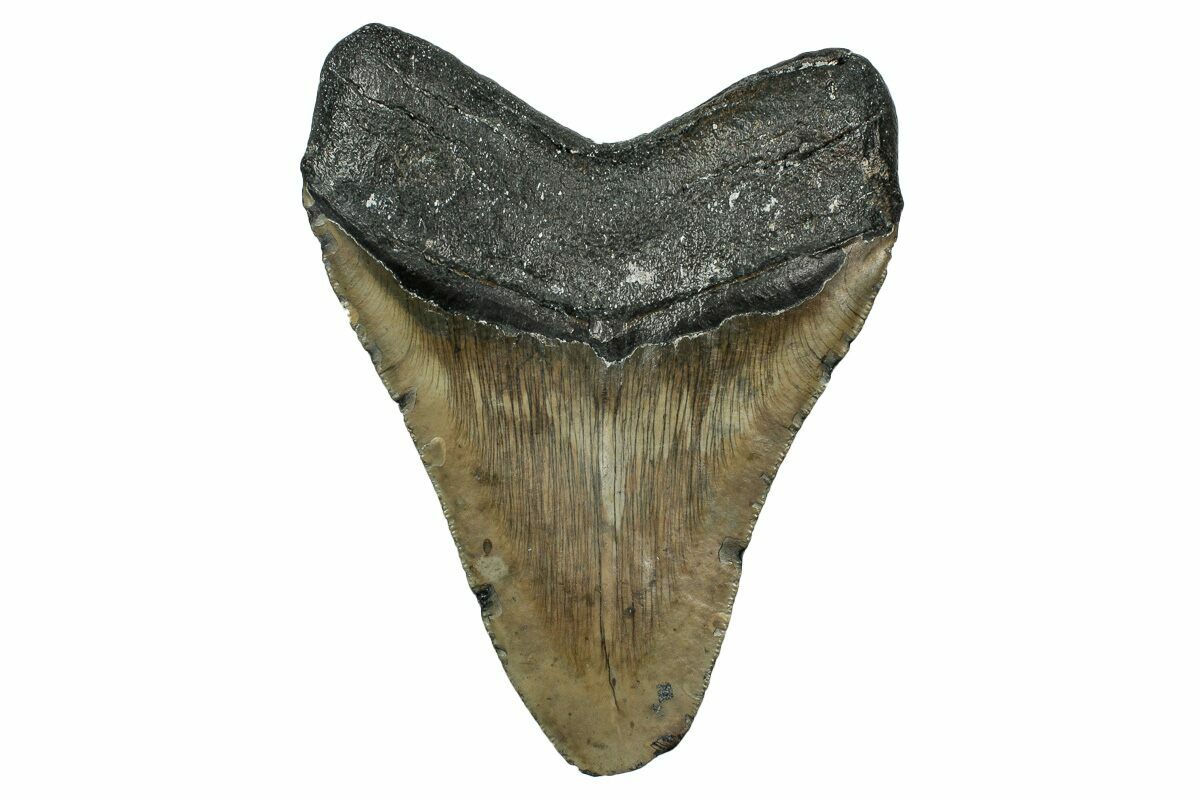 The standard measure for megalodon teeth is slant height, or the longest edge of the tooth. Adult megalodon teeth were typically in the 4 to 5 inch range: teeth over 6 inches are rare and represent super-sized individuals. Only a handful of teeth have ever been found over seven inches.