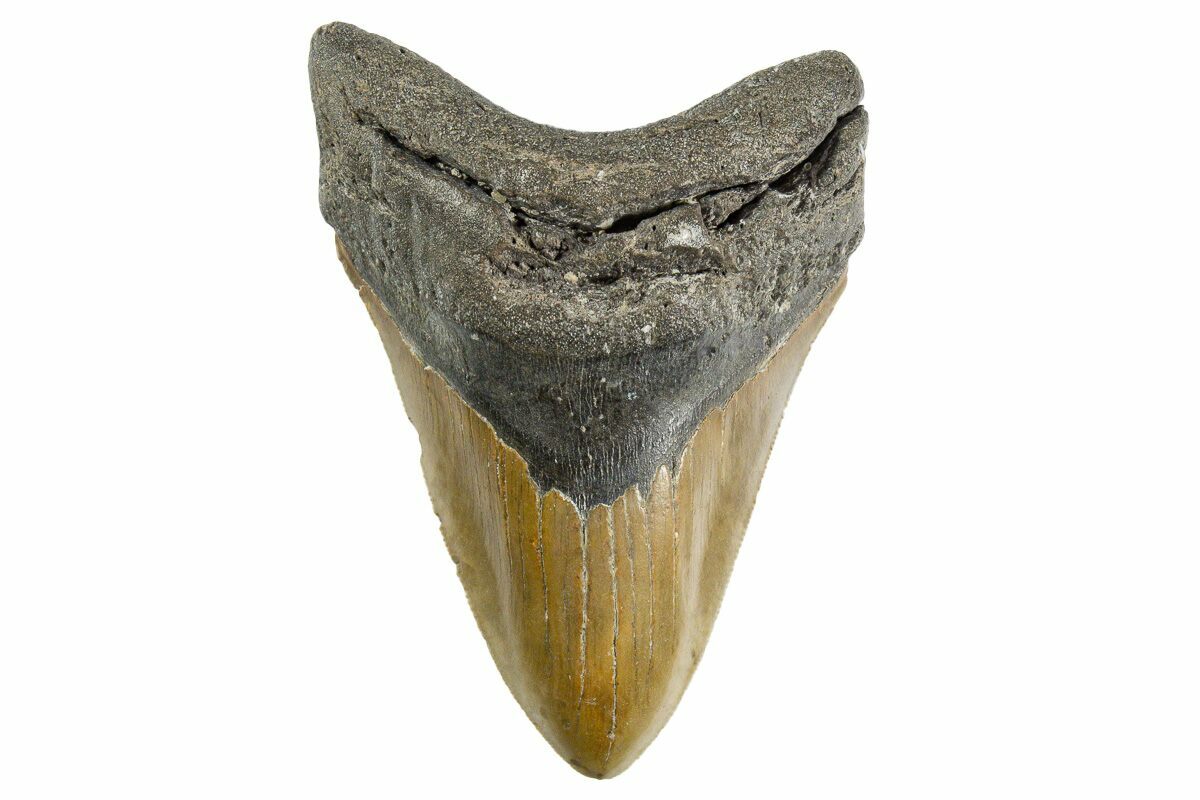 The standard measure for megalodon teeth is slant height, or the longest edge of the tooth. Adult megalodon teeth were typically in the 4 to 5 inch range: teeth over 6 inches are rare and represent super-sized individuals. Only a handful of teeth have ever been found over seven inches.