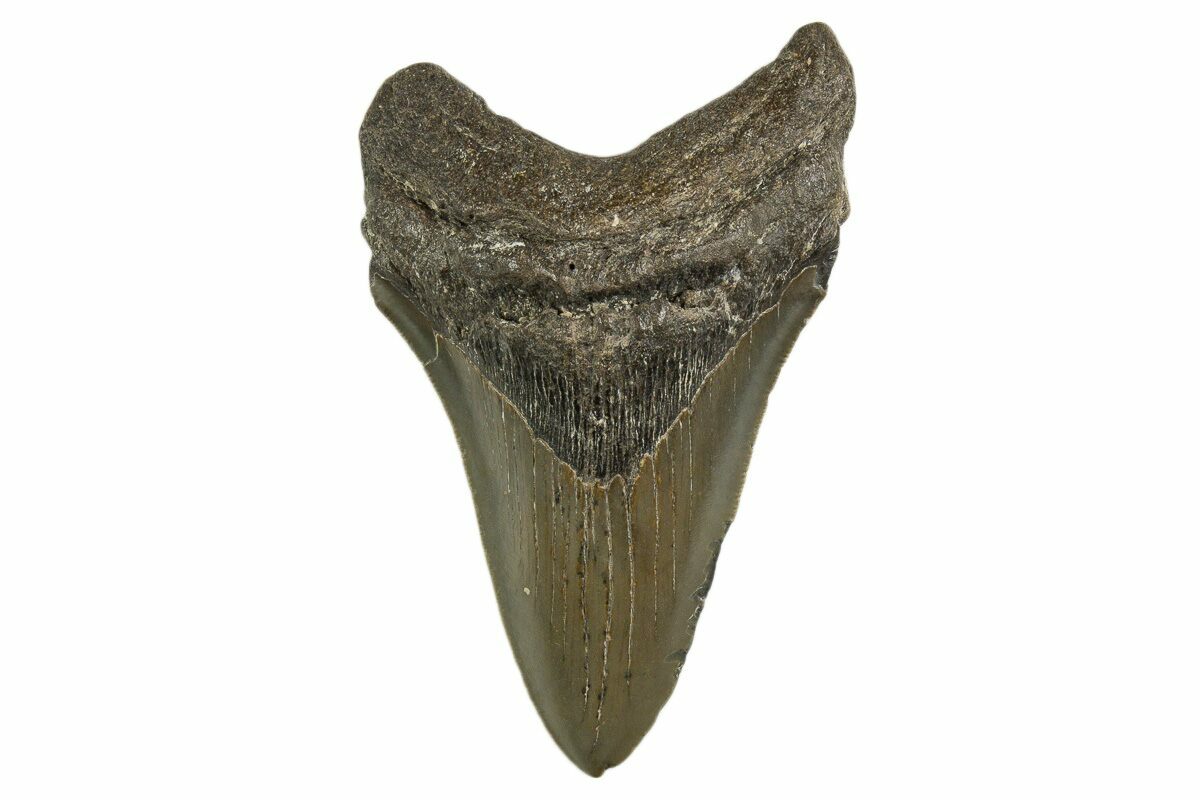 The standard measure for megalodon teeth is slant height, or the longest edge of the tooth. Adult megalodon teeth were typically in the 4 to 5 inch range: teeth over 6 inches are rare and represent super-sized individuals. Only a handful of teeth have ever been found over seven inches.