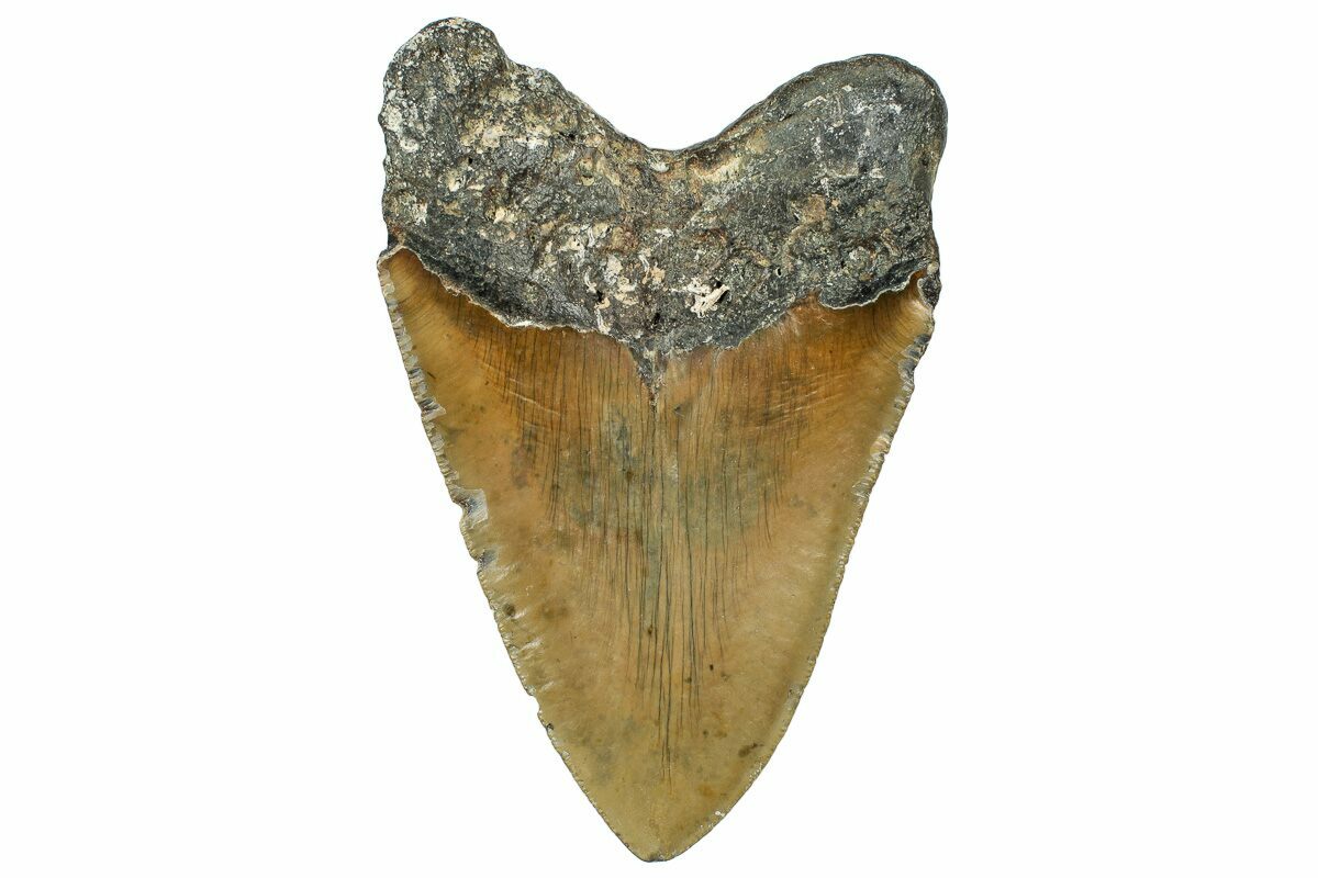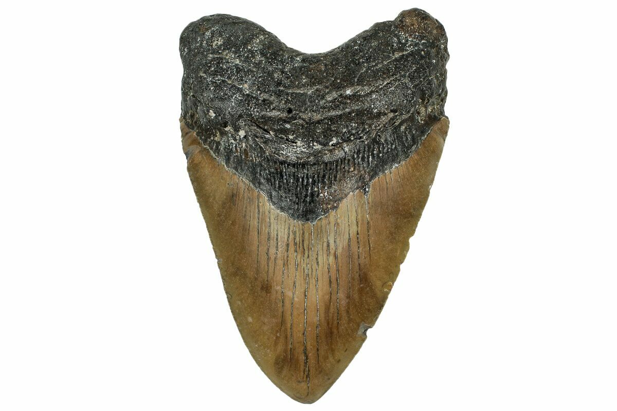 The standard measure for megalodon teeth is slant height, or the longest edge of the tooth. Adult megalodon teeth were typically in the 4 to 5 inch range: teeth over 6 inches are rare and represent super-sized individuals. Only a handful of teeth have ever been found over seven inches.