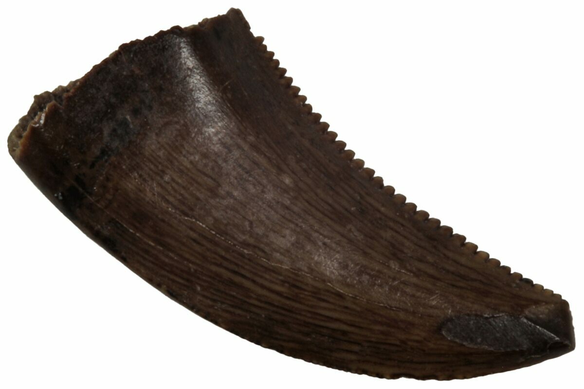 This is a gorgeous, serrated, .40" long dromaeosaurid theropod (Acheroraptor temertyorum) tooth from the Hell Creek Formation in Montana. It shows well defined serrations along the distal edge and excellent enamel preservation. The serrations are very small and best viewed under magnification.
