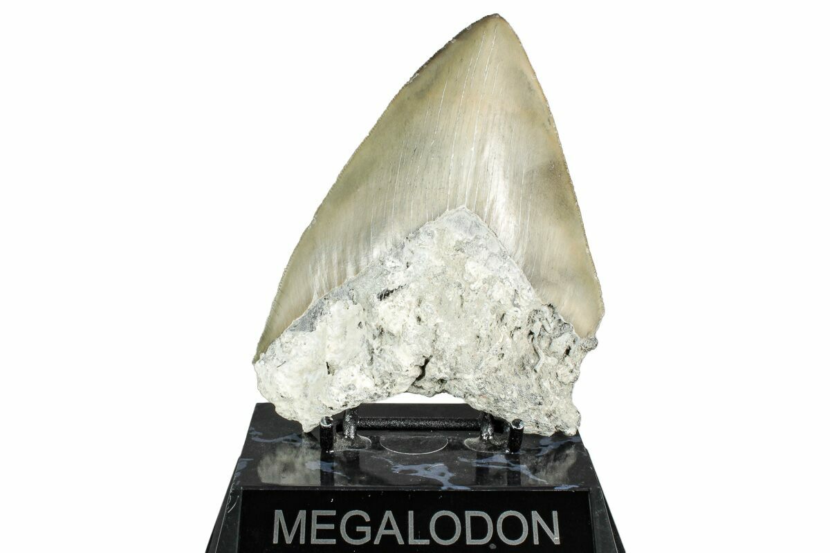 The standard measure for megalodon teeth is slant height, or the longest edge of the tooth. Adult megalodon teeth were typically in the 4 to 5 inch range: teeth over 6 inches are rare and represent super-sized individuals. Only a handful of teeth have ever been found over seven inches.