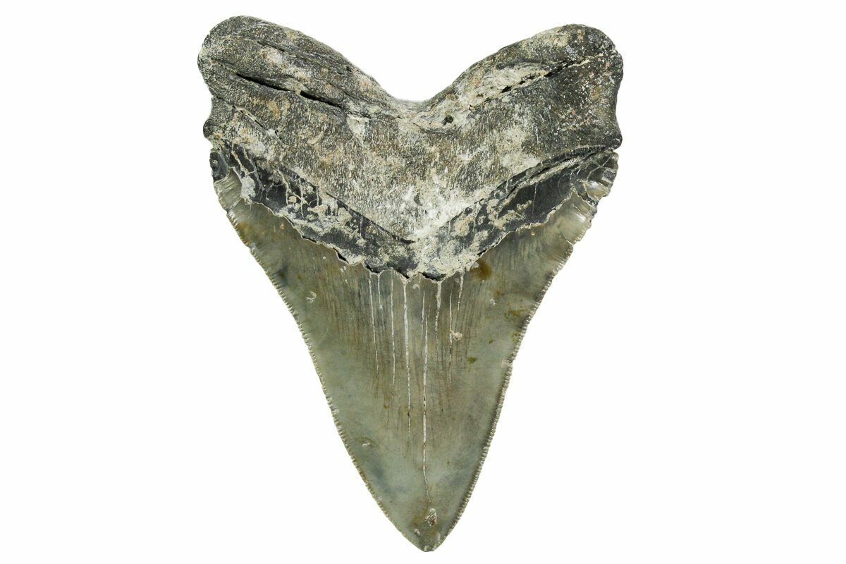 The standard measure for megalodon teeth is slant height, or the longest edge of the tooth. Adult megalodon teeth were typically in the 4 to 5 inch range: teeth over 6 inches are rare and represent super-sized individuals. Only a handful of teeth have ever been found over seven inches.