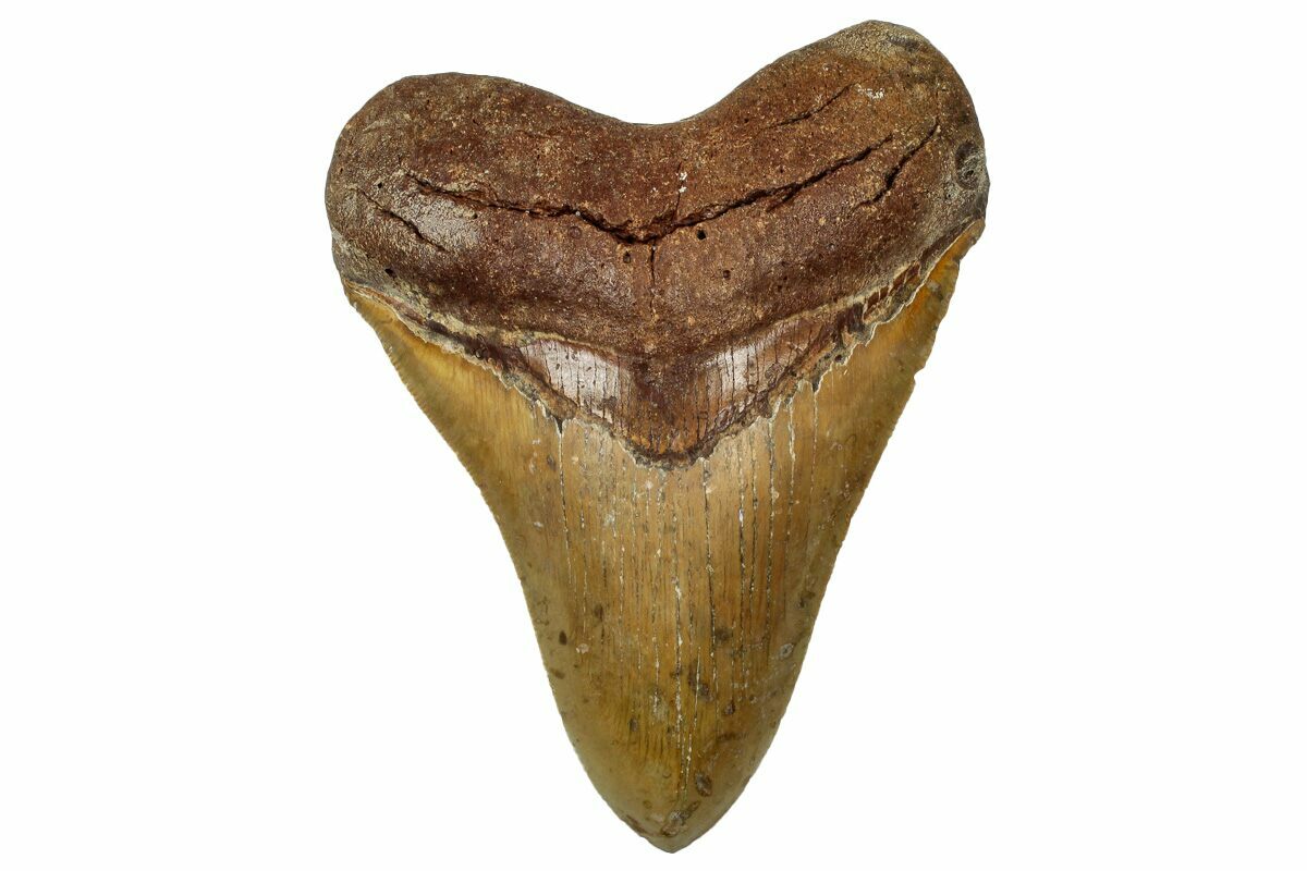 The standard measure for megalodon teeth is slant height, or the longest edge of the tooth. Adult megalodon teeth were typically in the 4 to 5 inch range: teeth over 6 inches are rare and represent super-sized individuals. Only a handful of teeth have ever been found over seven inches.