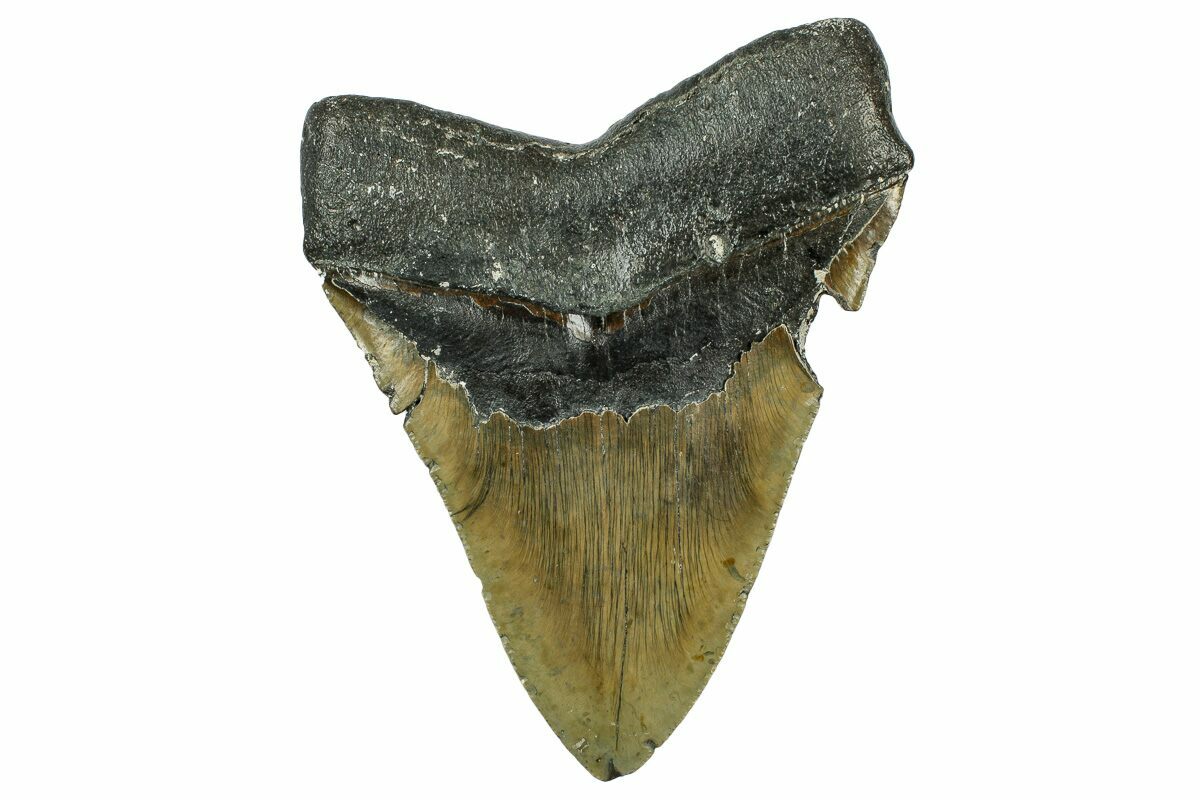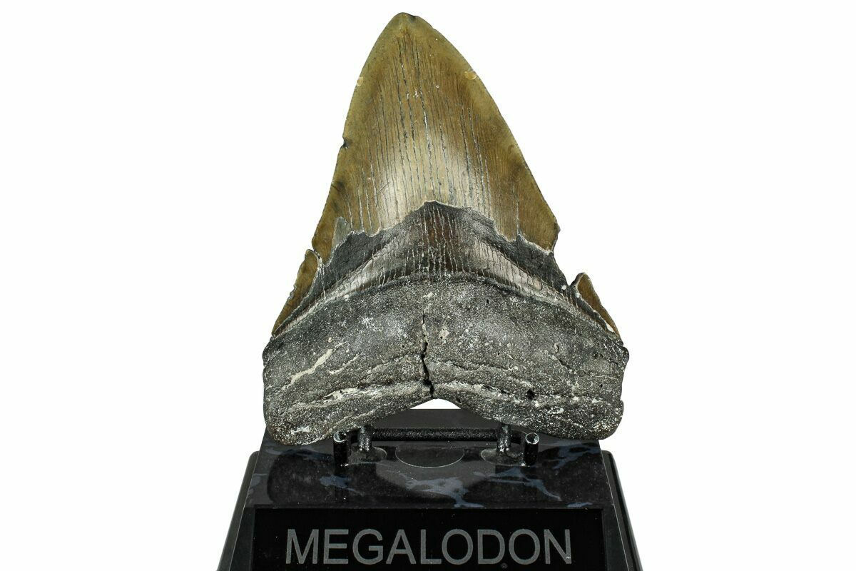 The standard measure for megalodon teeth is slant height, or the longest edge of the tooth. Adult megalodon teeth were typically in the 4 to 5 inch range: teeth over 6 inches are rare and represent super-sized individuals. Only a handful of teeth have ever been found over seven inches.