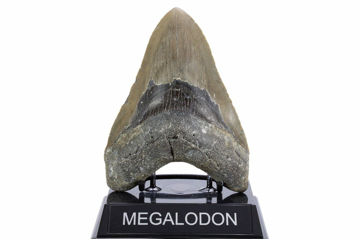 The standard measure for megalodon teeth is slant height, or the longest edge of the tooth. Adult megalodon teeth were typically in the 4 to 5 inch range: teeth over 6 inches are rare and represent super-sized individuals. Only a handful of teeth have ever been found over seven inches.