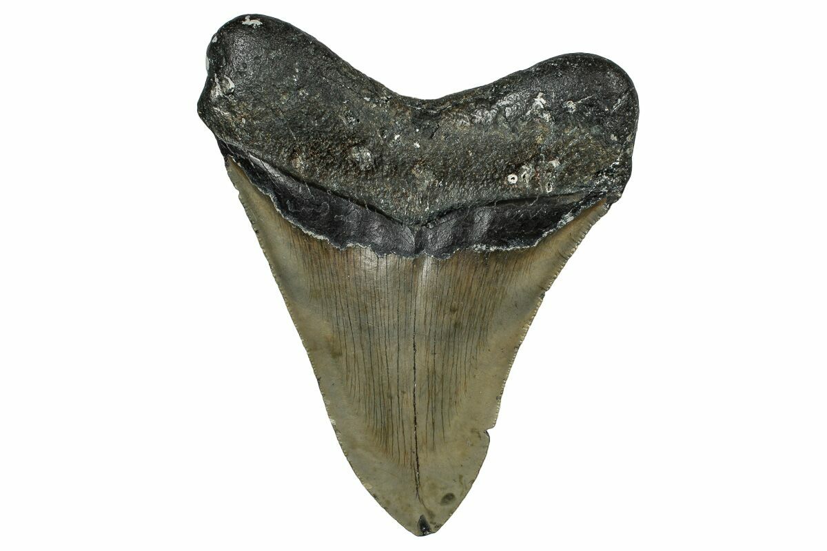 The standard measure for megalodon teeth is slant height, or the longest edge of the tooth. Adult megalodon teeth were typically in the 4 to 5 inch range: teeth over 6 inches are rare and represent super-sized individuals. Only a handful of teeth have ever been found over seven inches.