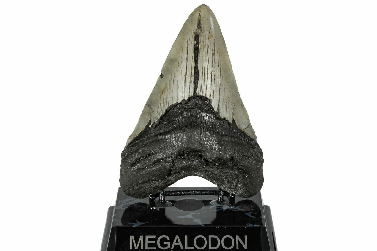 The standard measure for megalodon teeth is slant height, or the longest edge of the tooth. Adult megalodon teeth were typically in the 4 to 5 inch range: teeth over 6 inches are rare and represent super-sized individuals. Only a handful of teeth have ever been found over seven inches.