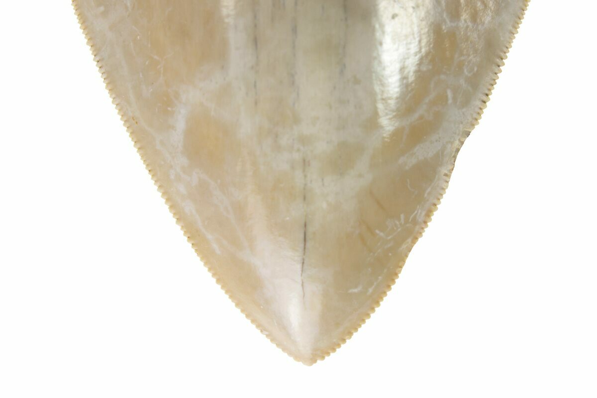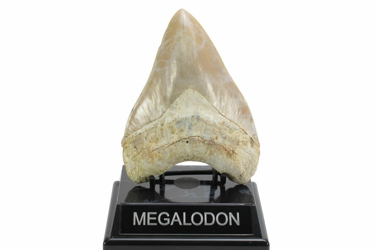 The standard measure for megalodon teeth is slant height, or the longest edge of the tooth. Adult megalodon teeth were typically in the 4 to 5 inch range: teeth over 6 inches are rare and represent super-sized individuals. Only a handful of teeth have ever been found over seven inches.
