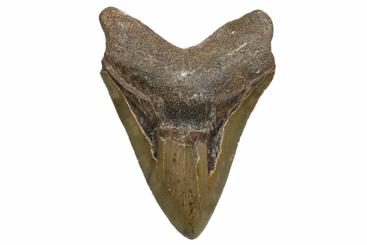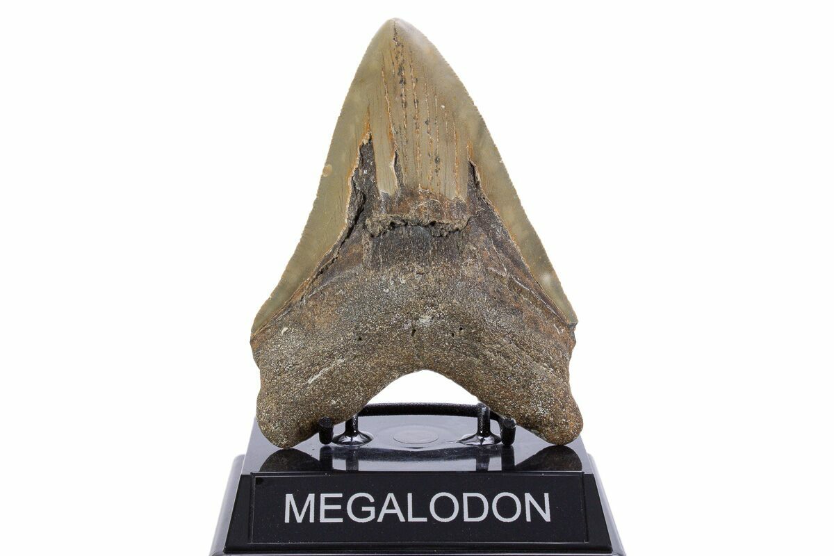 The standard measure for megalodon teeth is slant height, or the longest edge of the tooth. Adult megalodon teeth were typically in the 4 to 5 inch range: teeth over 6 inches are rare and represent super-sized individuals. Only a handful of teeth have ever been found over seven inches.