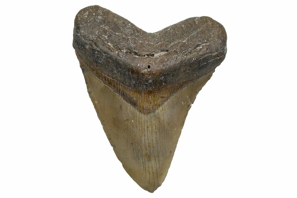 The standard measure for megalodon teeth is slant height, or the longest edge of the tooth. Adult megalodon teeth were typically in the 4 to 5 inch range: teeth over 6 inches are rare and represent super-sized individuals. Only a handful of teeth have ever been found over seven inches.