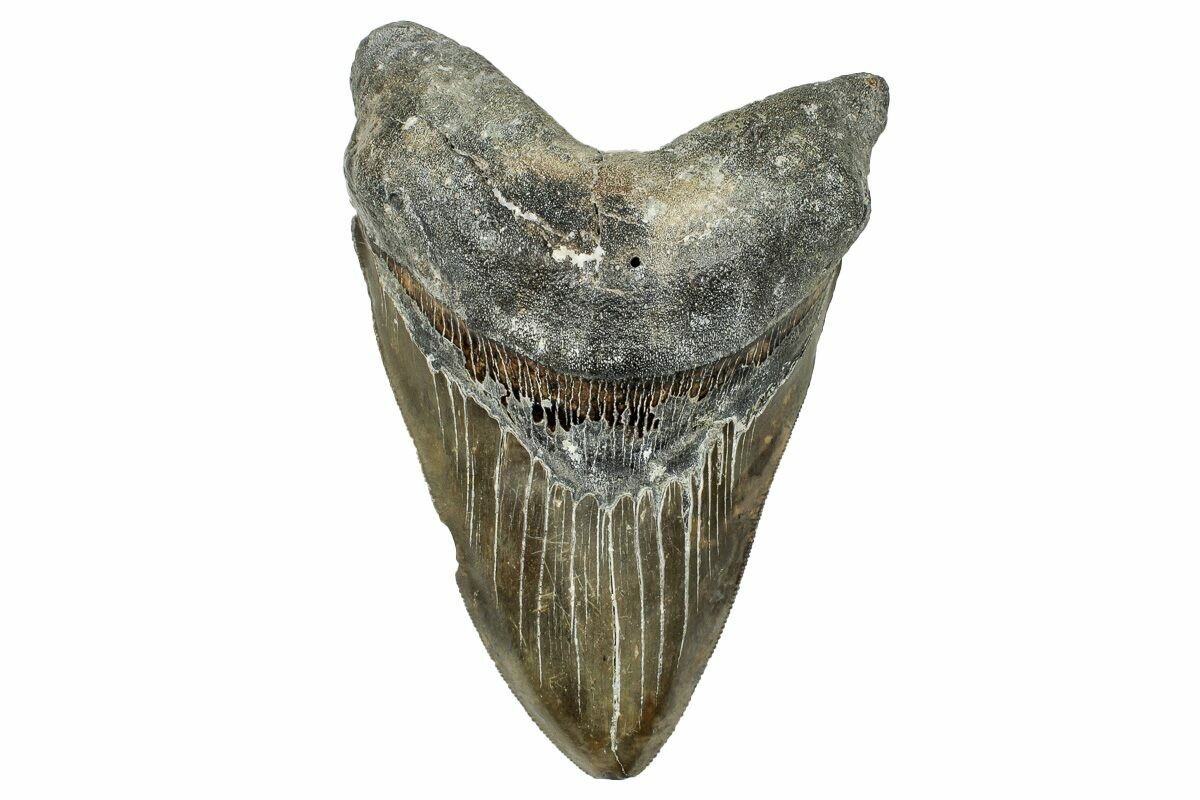 The standard measure for megalodon teeth is slant height, or the longest edge of the tooth. Adult megalodon teeth were typically in the 4 to 5 inch range: teeth over 6 inches are rare and represent super-sized individuals. Only a handful of teeth have ever been found over seven inches.