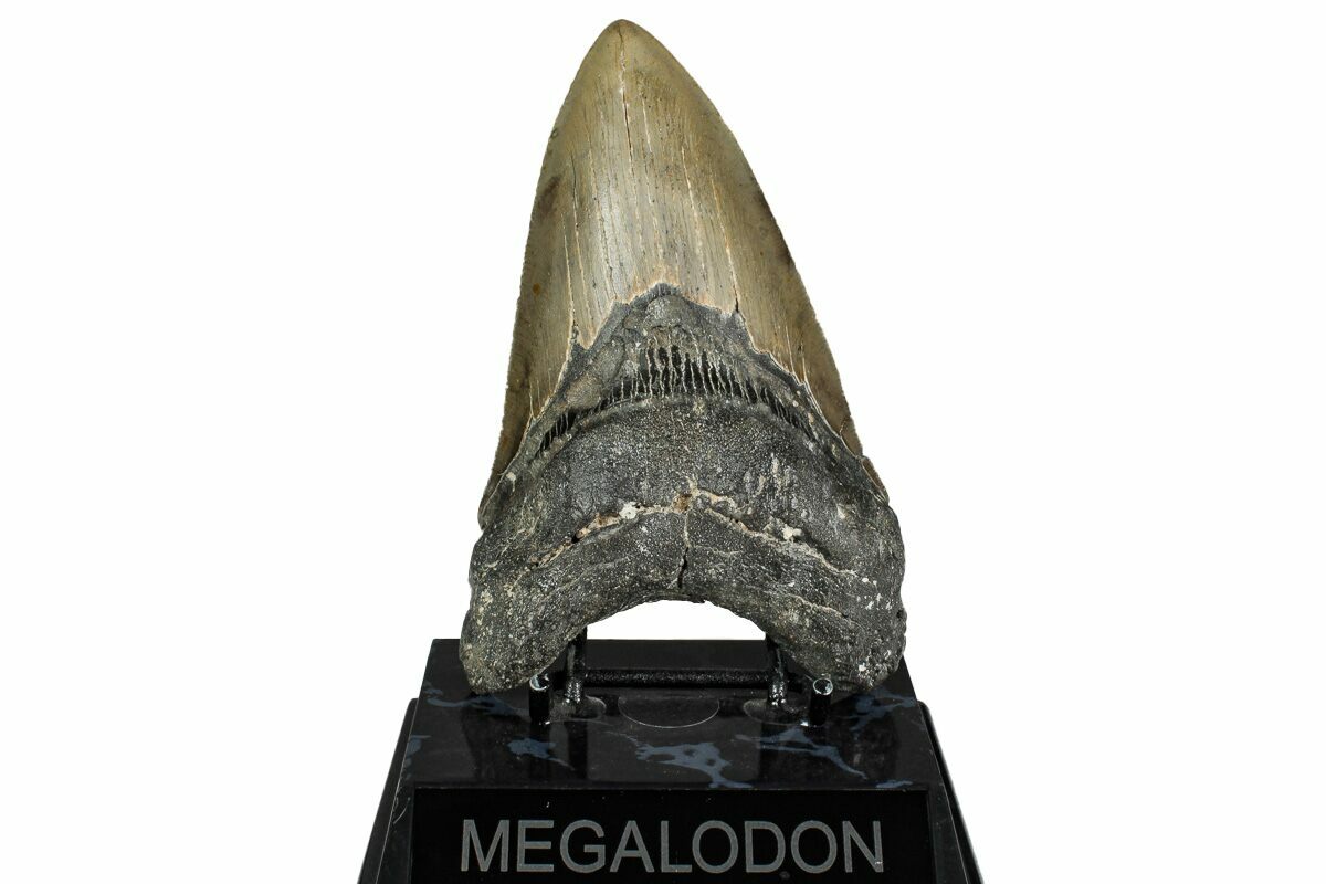 This is a large, serrated 5.32" long megalodon tooth collected on the North Carolina coast. It was found by commercial divers collecting "the ledges" in about 100 feet of water. It would have eroded out of the Pungo River Formation putting its age in the range of 13.8 to 16 million years old. A tooth of this size would have come from a prehistoric mega-shark in the 40 foot size range.