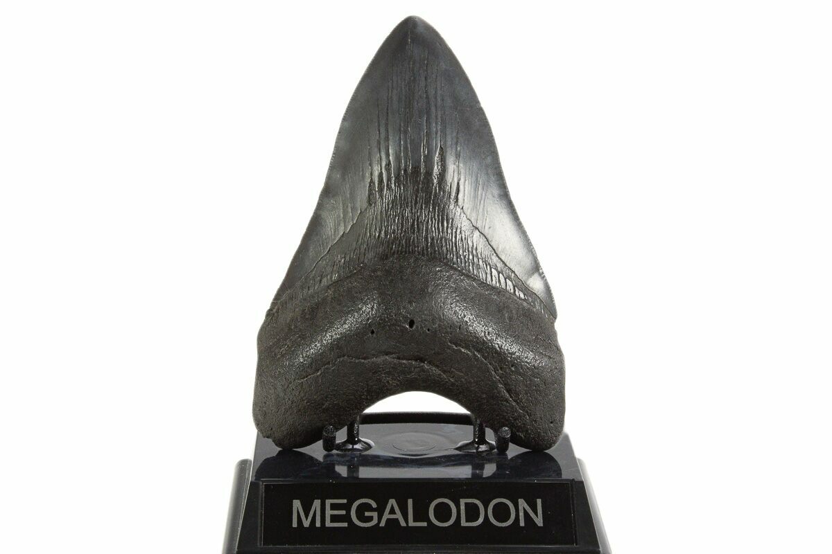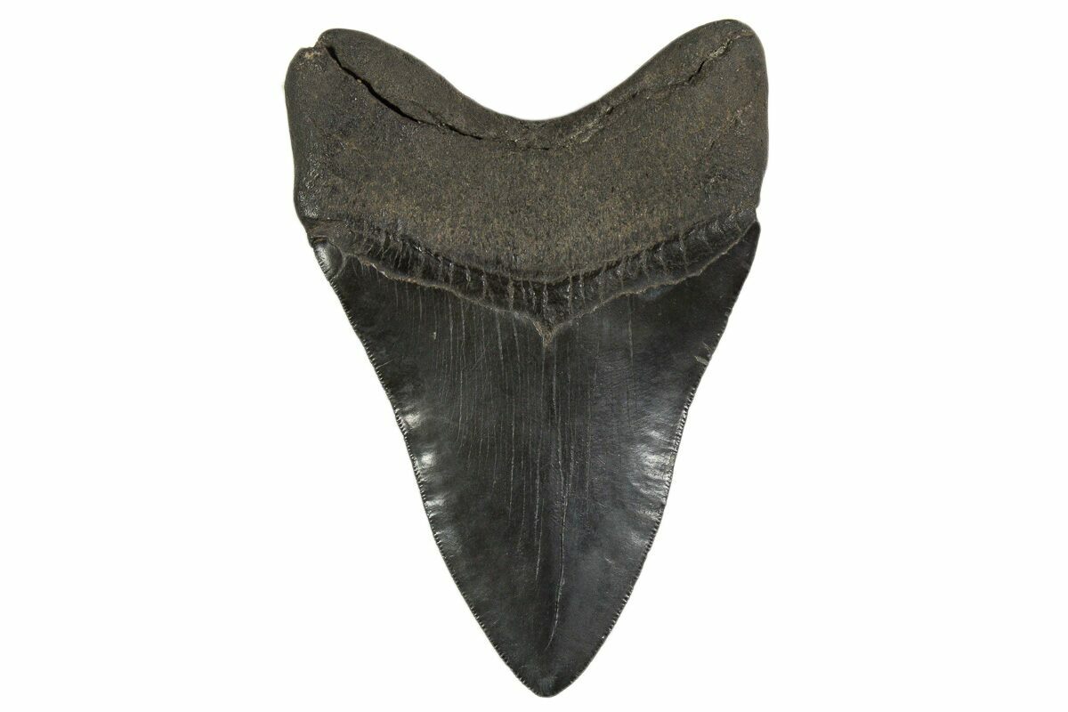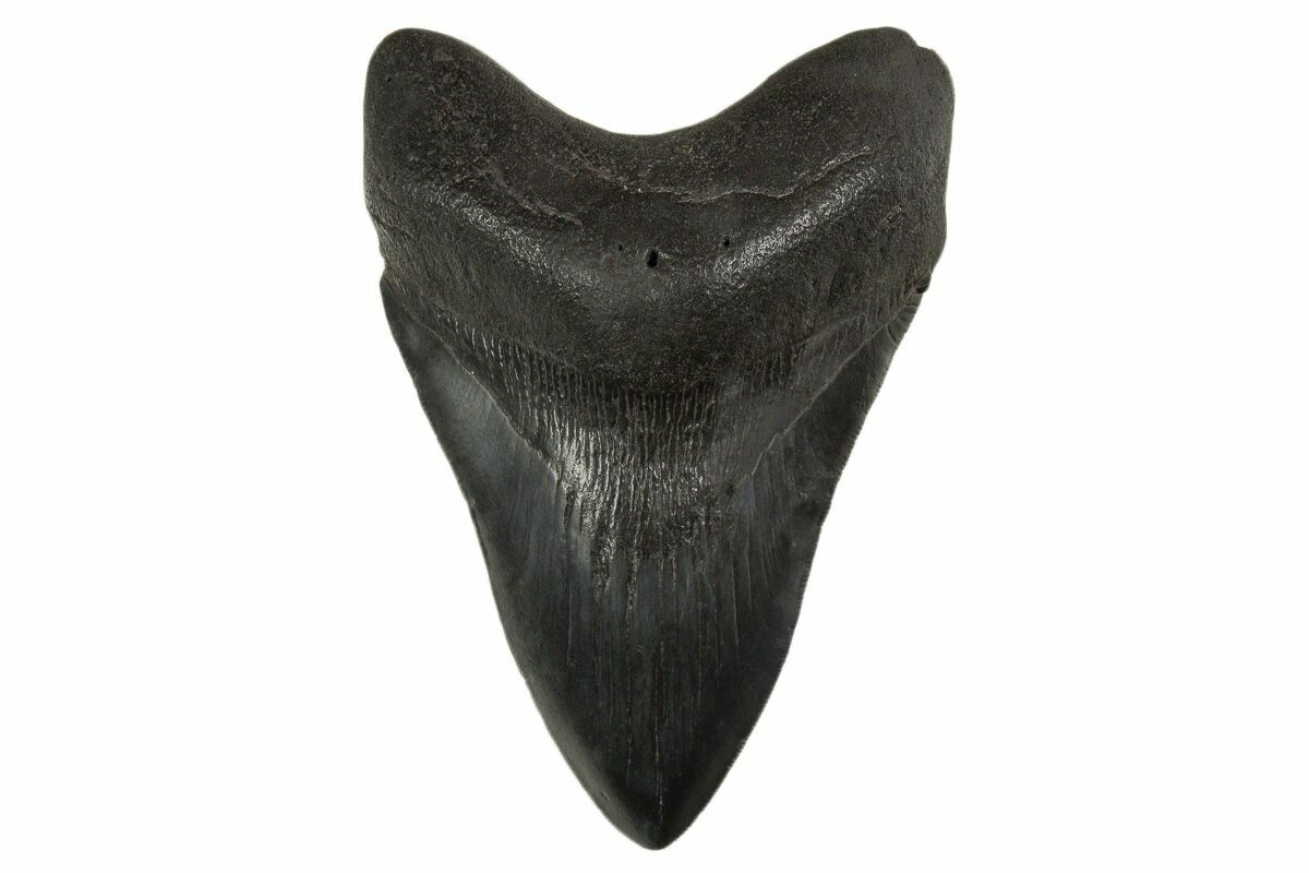 The standard measure for megalodon teeth is slant height, or the longest edge of the tooth. Adult megalodon teeth were typically in the 4 to 5 inch range: teeth over 6 inches are rare and represent super-sized individuals. Only a handful of teeth have ever been found over seven inches.