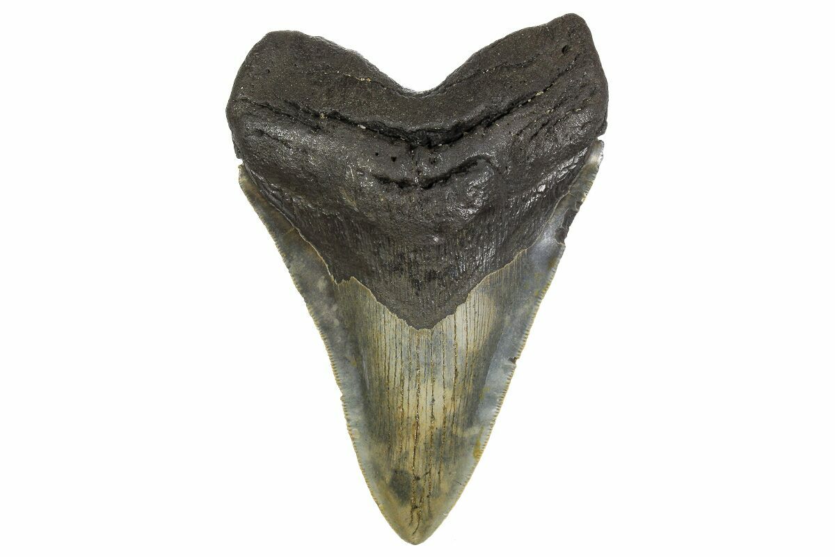 The standard measure for megalodon teeth is slant height, or the longest edge of the tooth. Adult megalodon teeth were typically in the 4 to 5 inch range: teeth over 6 inches are rare and represent super-sized individuals. Only a handful of teeth have ever been found over seven inches.