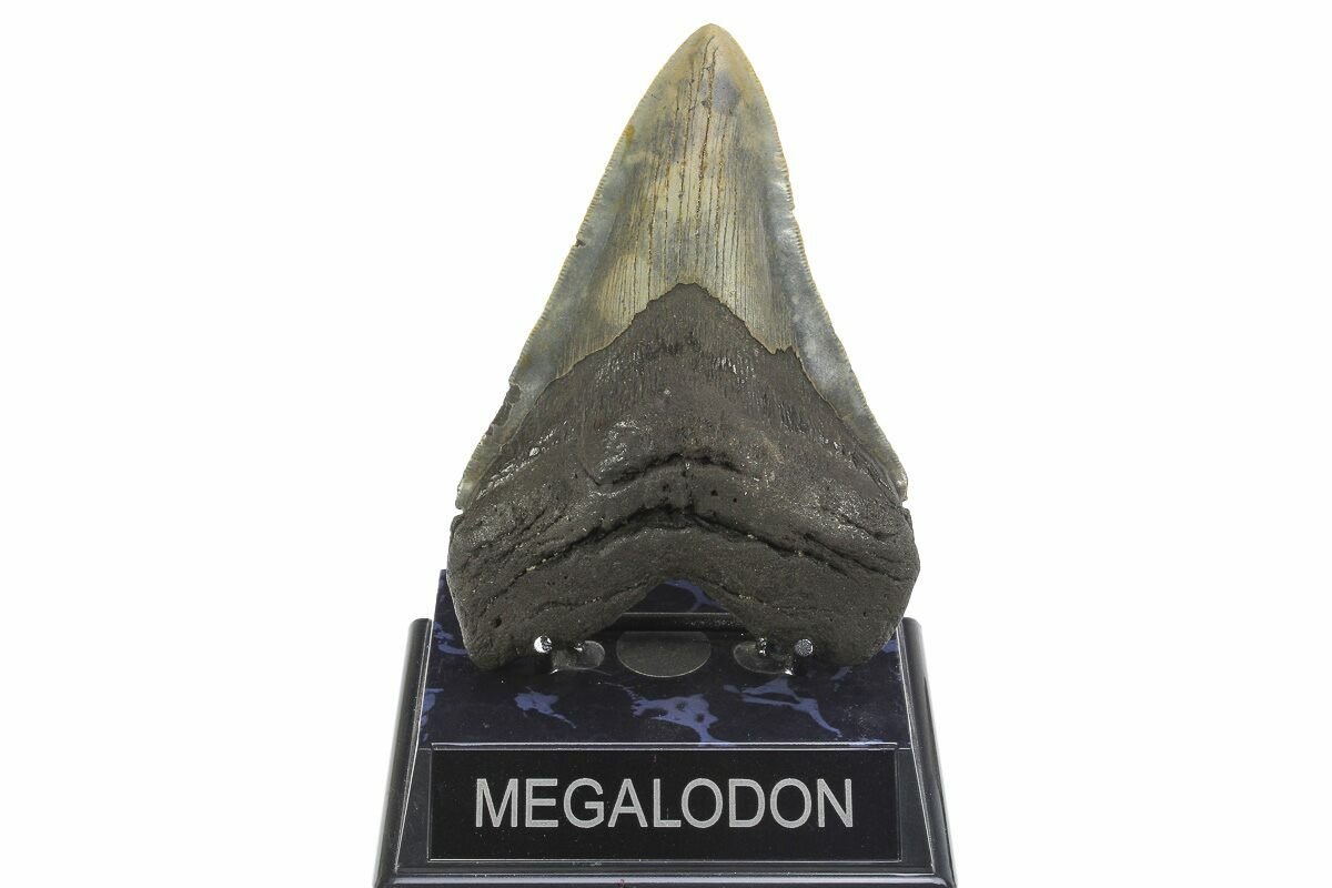 This is a large, 5.35" long megalodon tooth collected on the North Carolina coast. It was found by commercial divers collecting "the ledges" in about 100 feet of water. It would have eroded out of the Pungo River Formation putting its age in the range of 13.8 to 16 million years old. A tooth of this size would have come from a prehistoric, mega-shark in the 40 foot size range.