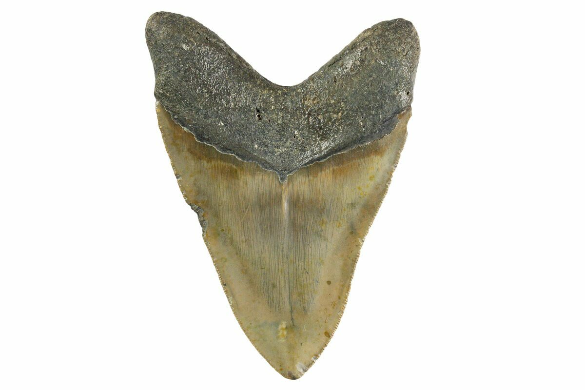 The standard measure for megalodon teeth is slant height, or the longest edge of the tooth. Adult megalodon teeth were typically in the 4 to 5 inch range: teeth over 6 inches are rare and represent super-sized individuals. Only a handful of teeth have ever been found over seven inches.