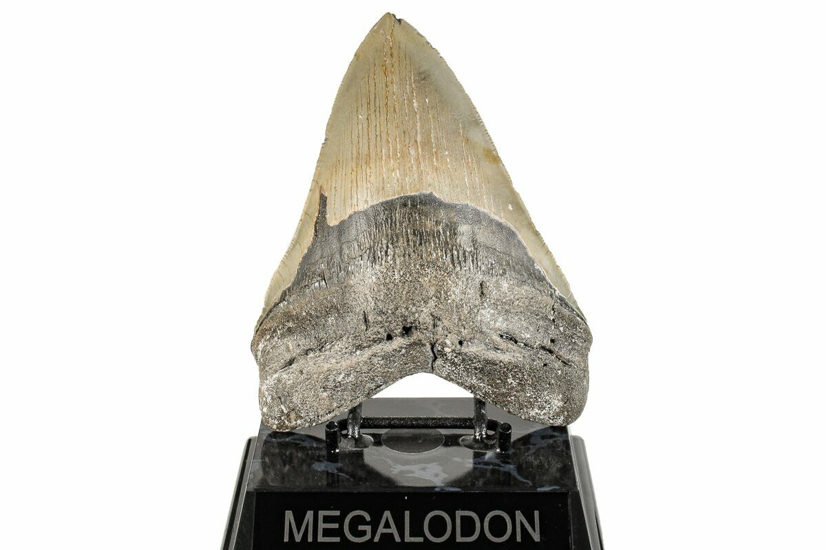 This is a large, serrated, 5.41" long megalodon tooth collected off the North Carolina coast. It was found by commercial divers collecting "the ledges" in about 100 feet of water. It would have eroded out of the Pungo River Formation putting its age in the range of 13.8 to 16 million years old.