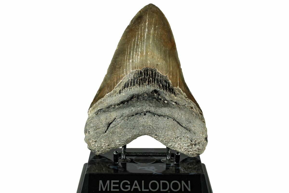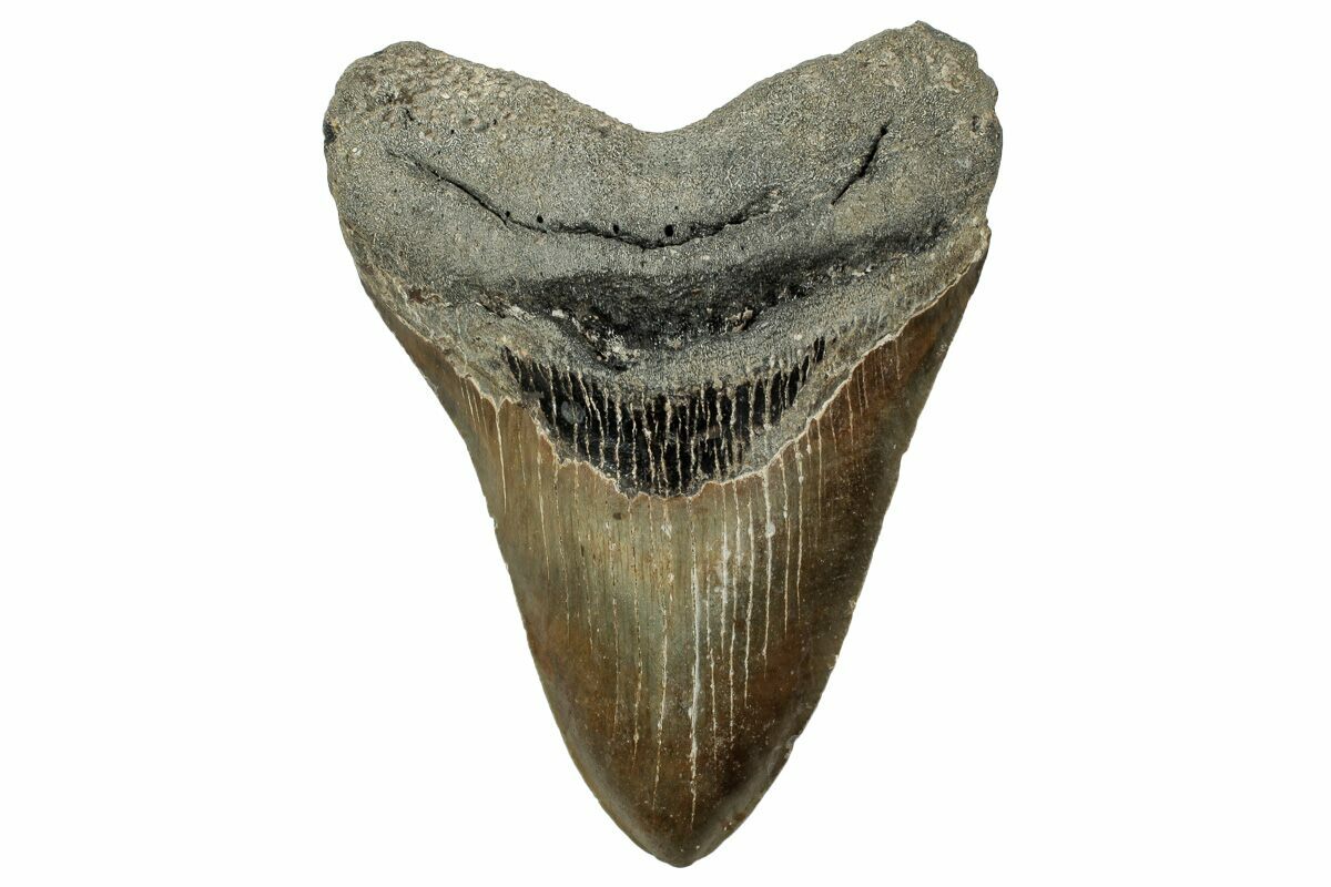 The standard measure for megalodon teeth is slant height, or the longest edge of the tooth. Adult megalodon teeth were typically in the 4 to 5 inch range: teeth over 6 inches are rare and represent super-sized individuals. Only a handful of teeth have ever been found over seven inches.