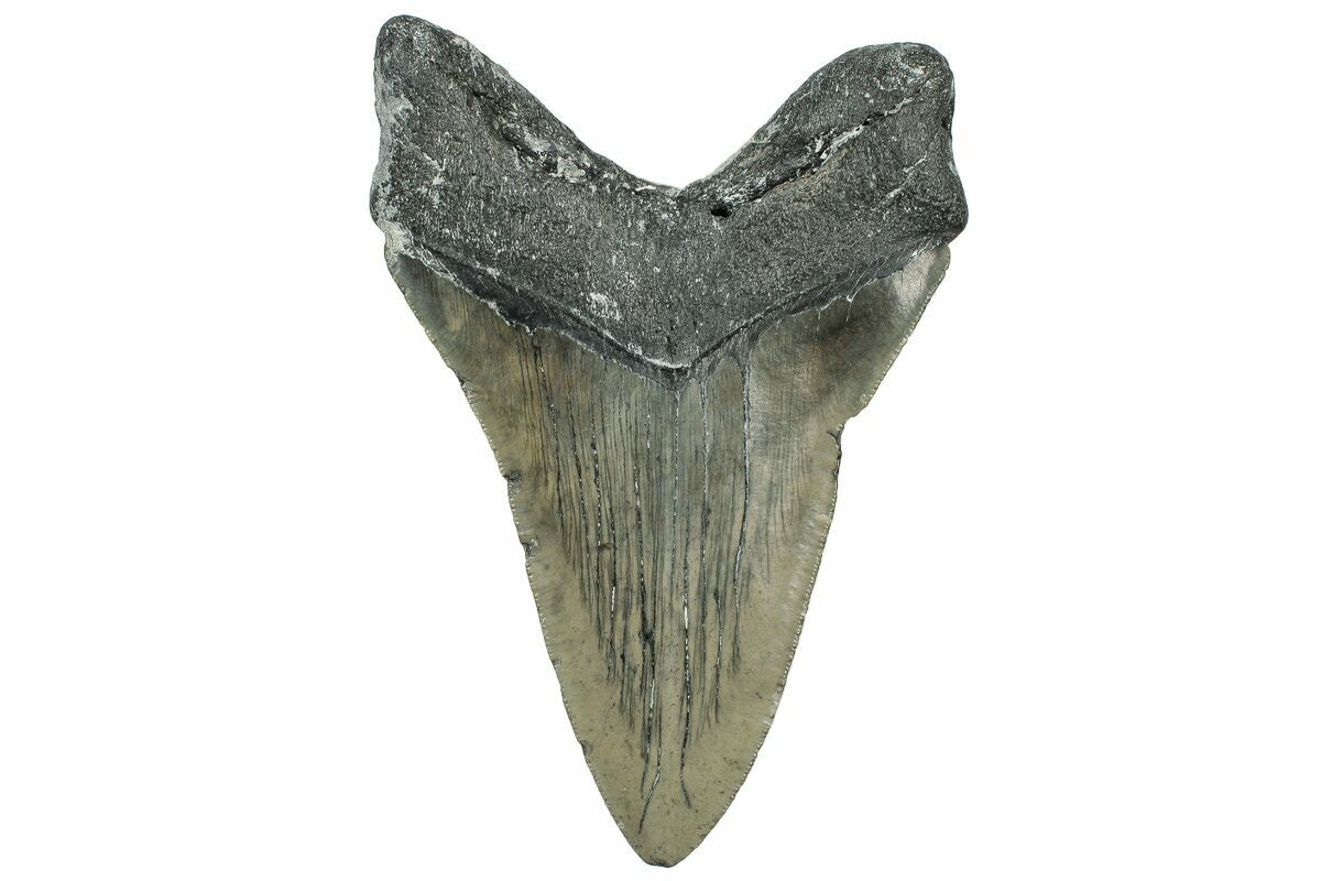 The standard measure for megalodon teeth is slant height, or the longest edge of the tooth. Adult megalodon teeth were typically in the 4 to 5 inch range: teeth over 6 inches are rare and represent super-sized individuals. Only a handful of teeth have ever been found over seven inches.